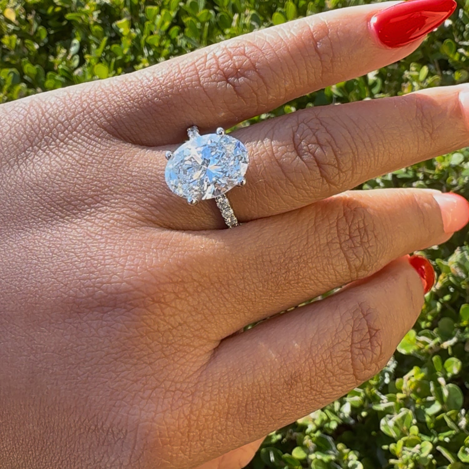Metal Type/Color: 14 Karat White Gold Diamond Carat Total Weight: 5 1/2 Ctw Center Diamond Carat Weight: 5 Carat Oval Lab Grown Average Diamond Color: F-G Average Diamond Color: VS # of Side Diamonds: 28 Round Lab Grown Diamonds Free 2 Day Shipping or In-Store Pickup