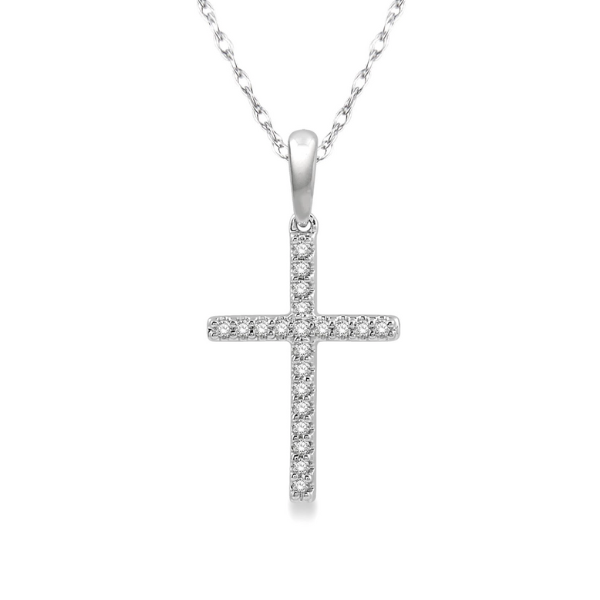 This diamond cross pendant offers appeal even in its simplicity. The pendant is enhanced with diamond embellishments to give it an elegant finish. 21 prong set round cut diamonds accentuate the cross pendant, lending it a dazzling shine. The pendant comes on an 18-inch link rope chain, both of which are styled in rhodium finish 10 karat white gold. Total diamond weight is 1/10 ctw. Free shipping or in-store pickup.