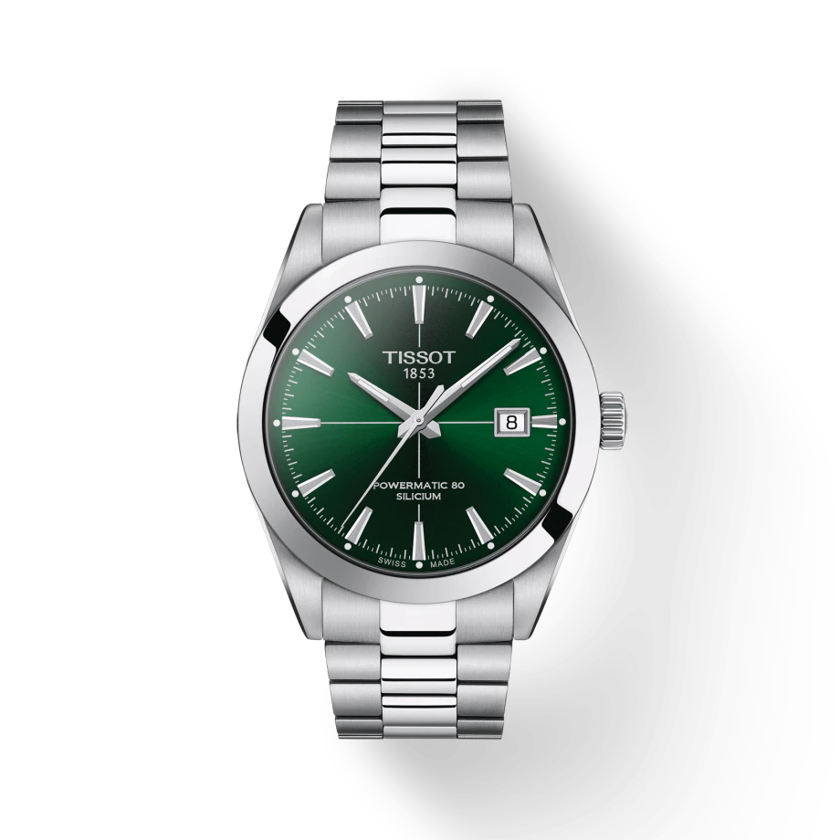 T Classic Collection Water Resistance: 100m Round Case Shape 316L Stainless Steel Case See Through Case Back 40.00mm Length & Width 11.5mm Thickness Domed Scratch Resistant Sapphire Crystal With Antireflective Coating HMSD Dial Power Reserve up to 80 Hours Swiss Automatic Movement Green Dial With Indexes Stainless Steel Strap With Butterfly Clasp and Push Buttons Free Shipping or In-Store Pickup