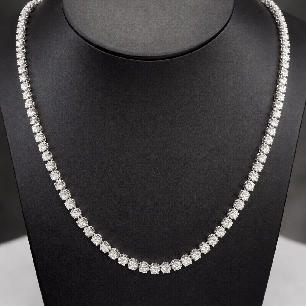Shop this stunning lab grown diamond tennis necklace in sterling silver with free two day shipping or in-store pickup. The necklace is 5 ctw of lab grown diamonds and 17 inches in length. Metal Type/Color: Sterling Silver Diamond Carat Total Weight: 5 Ctw Total # of Diamonds: 112 Round Lab Grown Diamonds Necklace Length: 17 Inches.