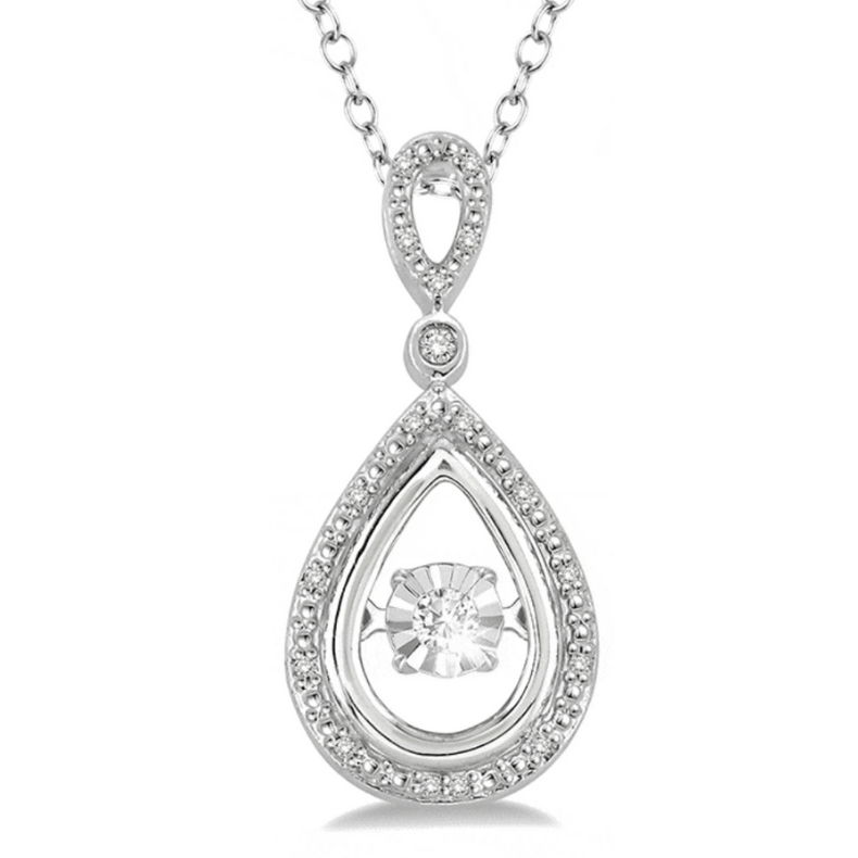 Add charm and elegance to her neckline with this alluring diamond emotion pendant. Crafted in sterling silver this pendant with a pear shape design is embellished with scintillating 18 pave set round cut diamonds along with the front edge. A round cut diamond, the centre piece of the pendant, glints and gleams with her every step. This pendant hangs from a ravishing cable chain. Total diamond weight is 1/10 ctw.