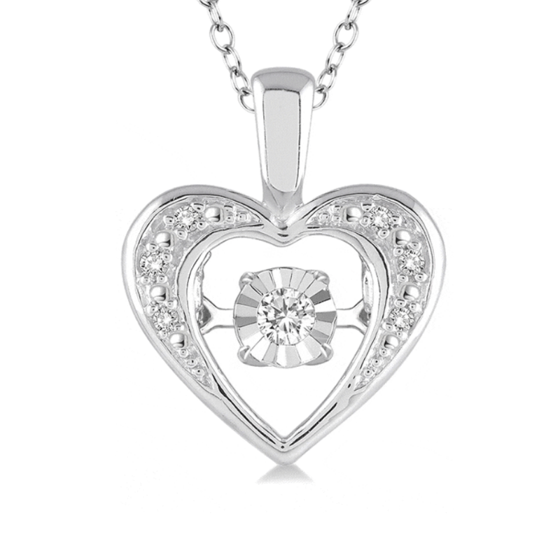 Symbolize the pure feeling of togetherness with this diamond emotion pendant. Illuminated with sterling silver this pendant features a center diamond that moves with every step she takes. Sparkling with a Cable chain, the heart frame pendant is embellished by brilliant 6 pave set round cut diamonds. Total diamond weight is 1/20 ctw. Enjoy free two day shipping or in-store pickup.