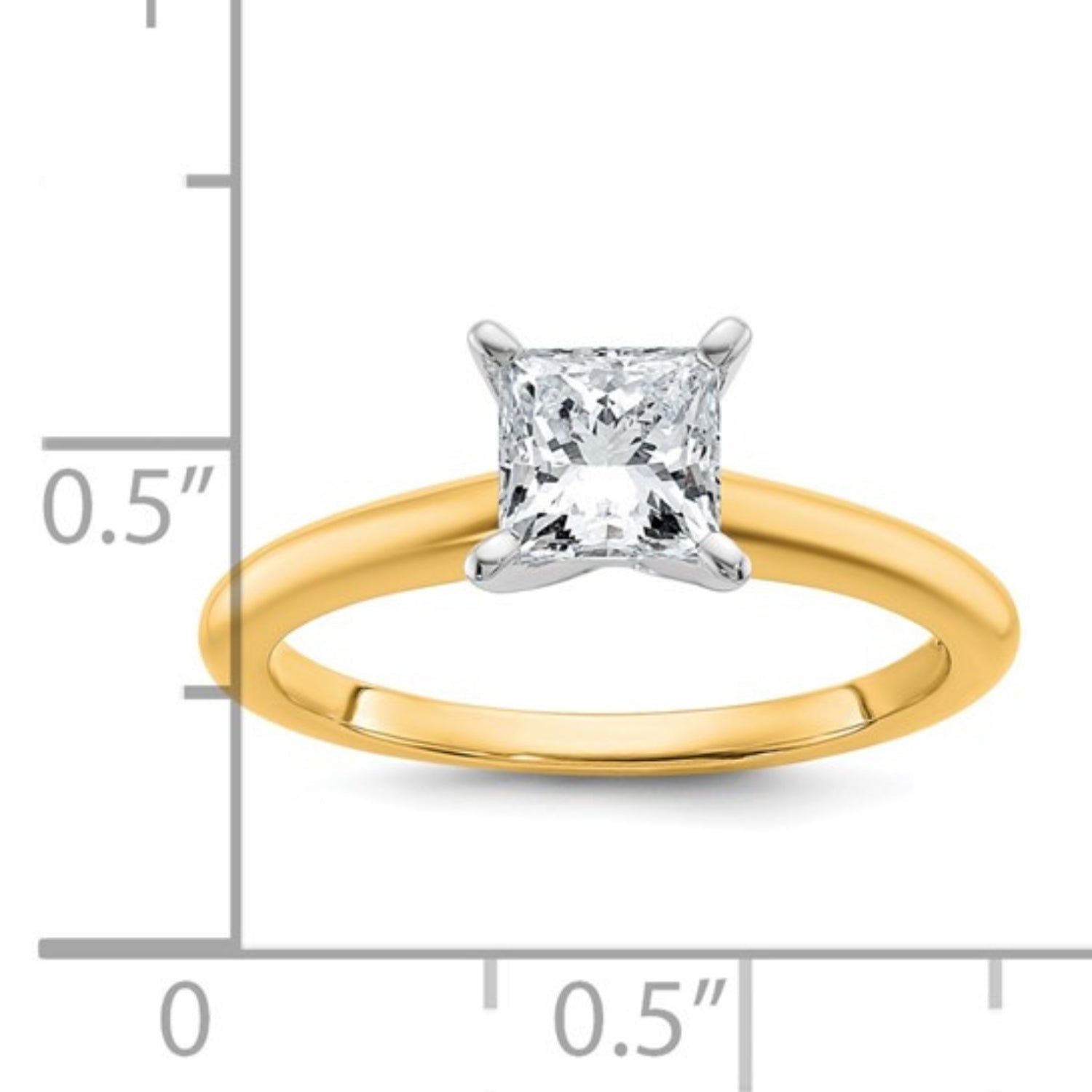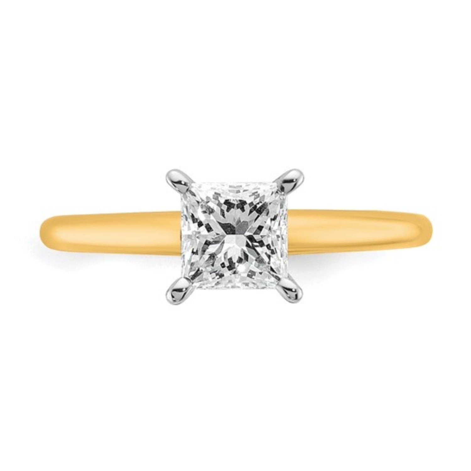 Shop this beautiful 1 Carat Princess Cut Solitaire Lab Grown Diamond Engagement Ring in 14 Karat Yellow and White Gold with free two day shipping or in-store pickup. Metal Type/Color: 14 Karat Yellow Gold with 14 Karat White Gold Head Diamond Carat Weight: 1 Carat Princess Cut Lab Grown Diamond. Diamond Color: E Color Diamond Clarity: VS1 Clarity