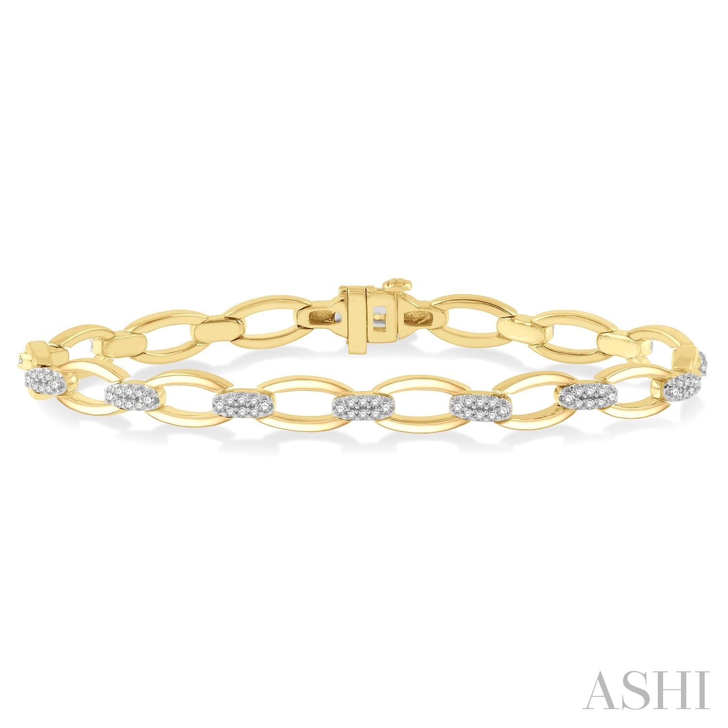 Add panache to your outfits, with large open link jewelry, like this diamond bracelet here. A point to remember when buying link jewelry is that the bolder the link chain, the better it looks. In this bracelet, we can see beautiful oval shape open links, connected via oval shape mounts that are decorated with round cut diamonds. Each of the 15 oval mounts is embellished with 8 each prong set round cut diamonds, total 120 diamonds. A snap-in open box closure with push-release clasp finishes the diamond link bracelet, which is crafted in 14 karat yellow gold. Total diamond weight is 3/4 ctw. Free shipping or in-store pickup.