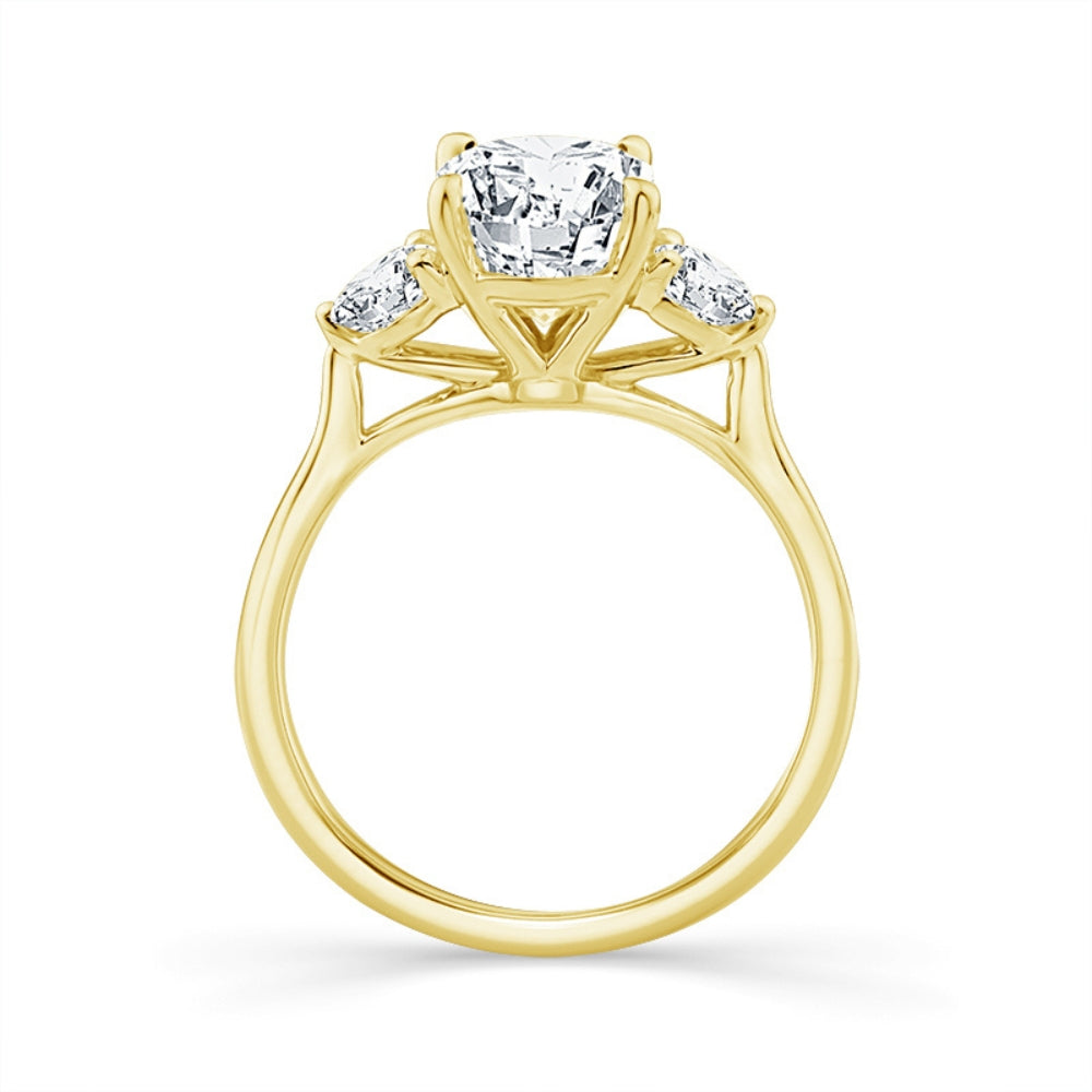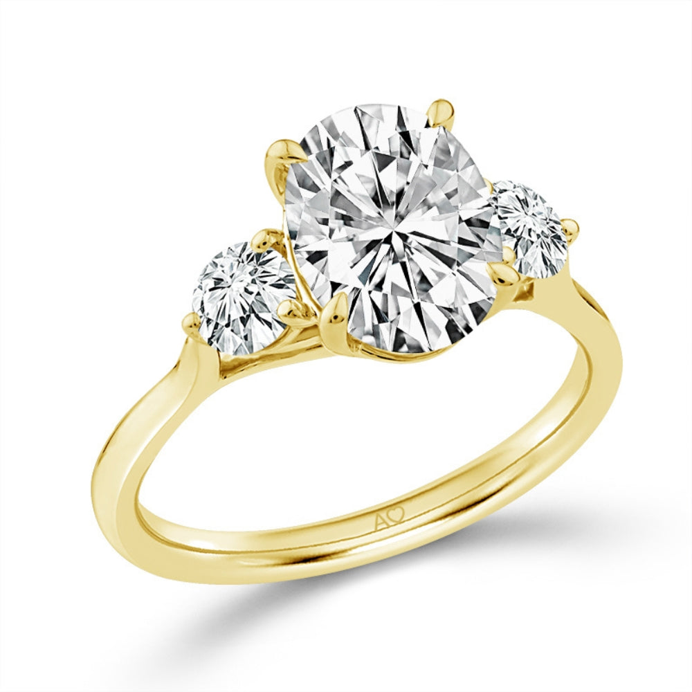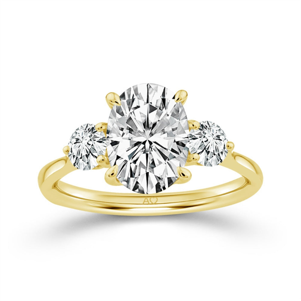 Metal: 14k Yellow Gold Total Diamond Weight: 3 Ctw or Larger Center Diamond Carat Weight Range: 2.82 - 2.88 Ct Oval Lab Grown Diamond # of Side Diamonds: 2 Round Lab Grown Diamonds (1/2 Ctw) Guaranteed Diamond Color Range: E-F Color Guaranteed Diamond Clarity Range: VS1-VS2 Cut: Excellent