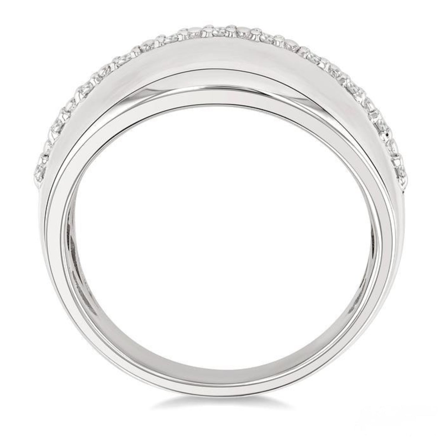 This simple but attractive, bold diamond fashion ring is versatile enough to complement any ensemble. It features a striking wide center that gracefully narrows down the shank, creating a sleek and contemporary silhouette. The focal point of the ring is a row of 11 prong set round cut diamonds, meticulously lined along the mid-rib of the ring top. Molded in sterling silver with a rhodium finish that enhances the overall brilliance of the diamonds, this ring makes for a true standout accessory. The total diamond weight is 1/10 Ctw.