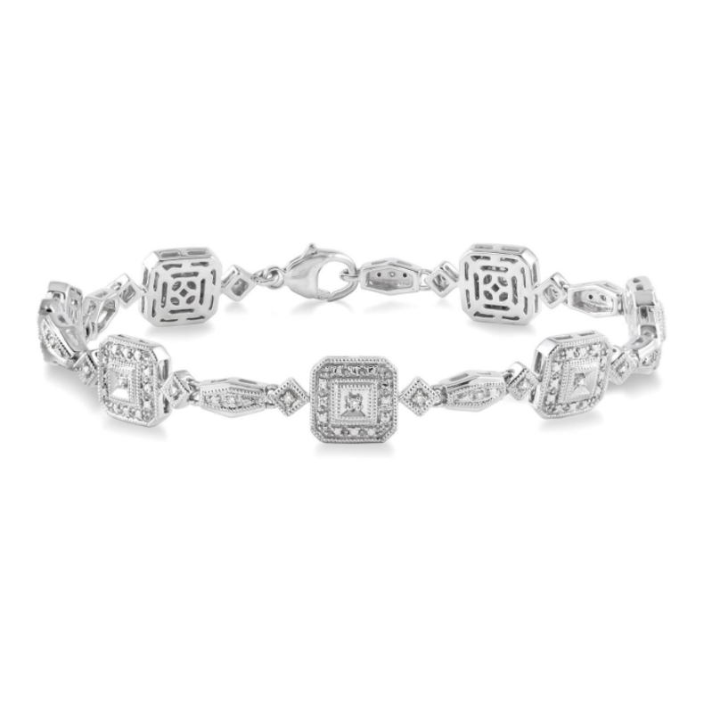 Wrap her wrist with the elegance of this breathtaking diamond bracelet. Styled in gleaming sterling silver, this square shaped bracelet is adorned with a galaxy of 28 single cut diamonds in prong set and fastens with a secure clasp. Total diamond weight is 1/6 ctw. Enjoy free two day shipping or in-store pickup.