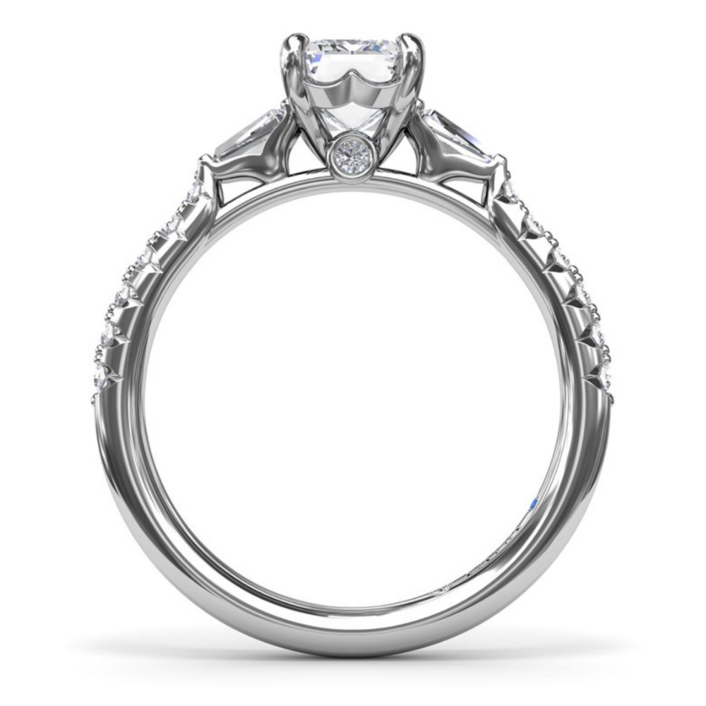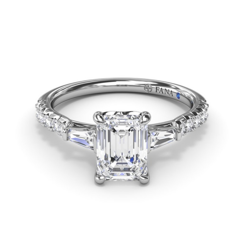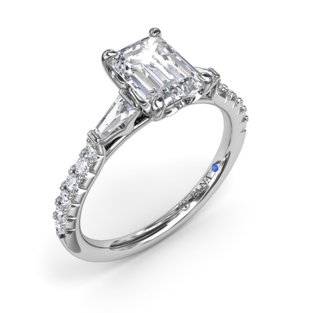Fana Emerald Cut and Tapered Baguette Engagement Ring Setting in 14 Karat White Gold