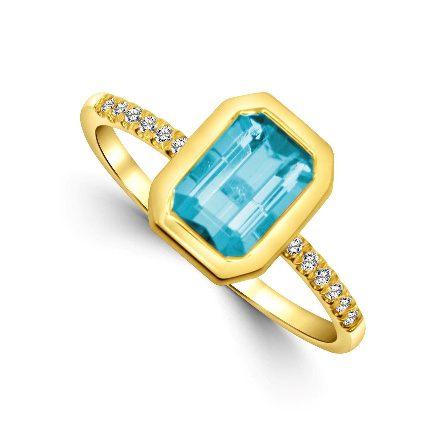 Shop this stunning bezel set emerald cut blue topaz and diamond fashion ring in 14 karat yellow gold with free two day shipping or in-store pickup.