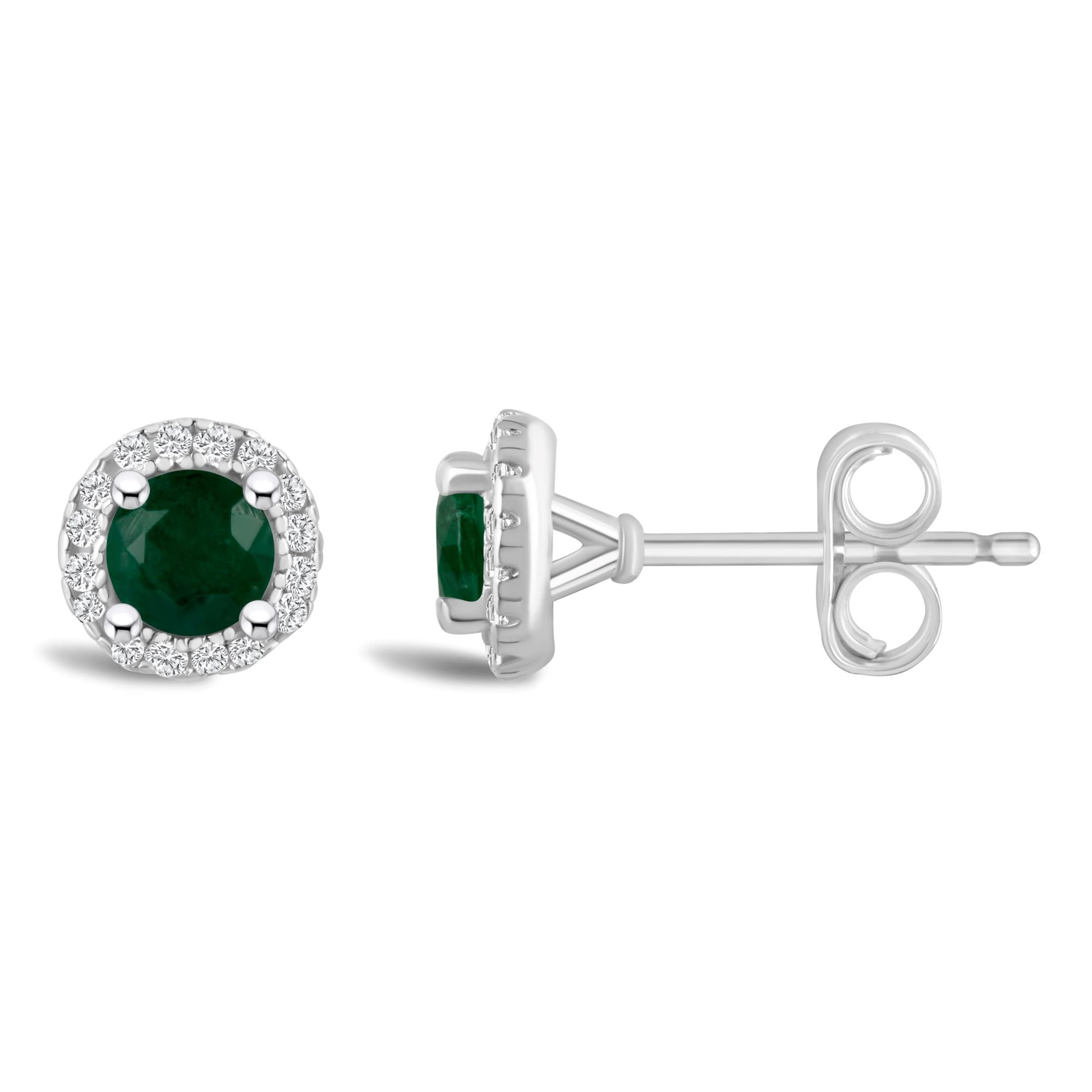 Shop these round emerald and diamond halo birthstone earrings in sterling silver with free two day shipping or in-store pickup.