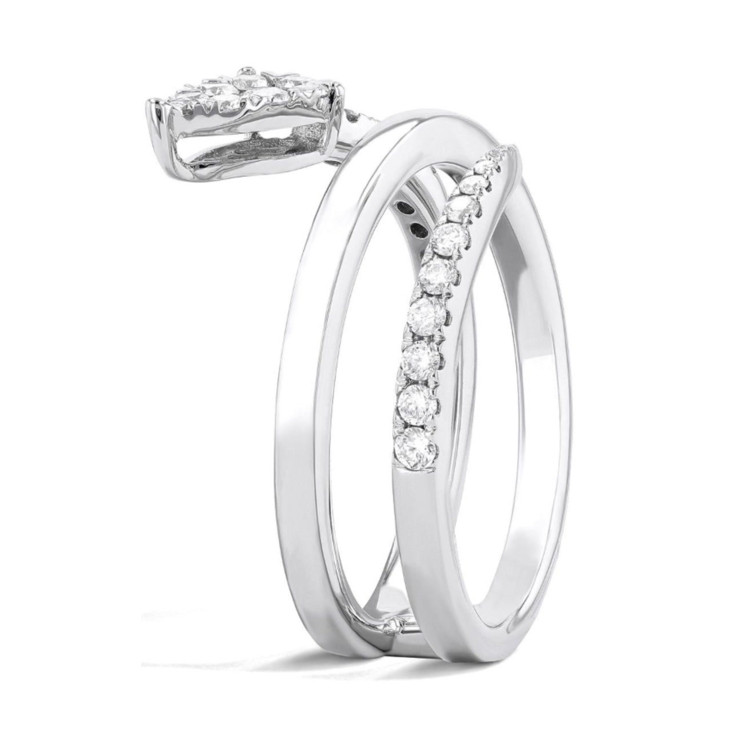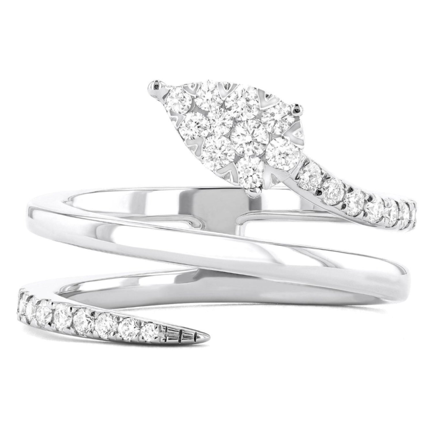 Introducing the Couture Fiori Pear Wrap Fashion Ring – a stunning piece that beautifully combines elegance and modern design. This exquisite ring features 1/2 carat total weight (Ctw) of dazzling round diamonds, intricately set in a captivating pear-shaped design. Crafted from premium 18K white gold, this ring showcases a unique wrap style that adds a touch of sophistication and flair to any outfit.