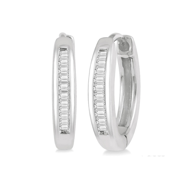 Huggie earrings are a staple in your collection if you like to highlight the ear. Do you know, diamond huggie earrings can make your look even better! Try these charming baguette diamond huggie earrings for a combination of vintage and modern looks. The huggie earrings feature a trench-like center that is neatly fitted with baguette diamonds. There are 10 each channel set baguette diamonds, total 20 on both earrings together, laid into the center groove in a close fit. The huggie earring is carved in a rhodium finish 10 karat white gold. Total diamond weight is 1/10 ctw. Free shipping or in-store pickup.