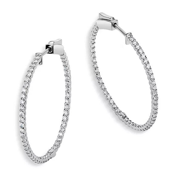 These stunning 14K white gold inside-out hoop earrings feature a dazzling 1 carat total weight of near-colorless diamonds, graded G-H color and SI1-SI2 clarity, expertly set to maximize sparkle from every angle. The inside-out design ensures that both the front and back of the hoops are adorned with brilliant diamonds, creating a continuous, radiant display of light. Perfect for adding a touch of luxury to any occasion, these hoops combine timeless style with modern sophistication. Whether for everyday wear or special events, these G-H color diamond hoop earrings are a must-have addition to any jewelry collection.