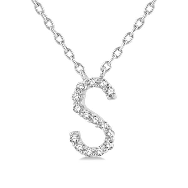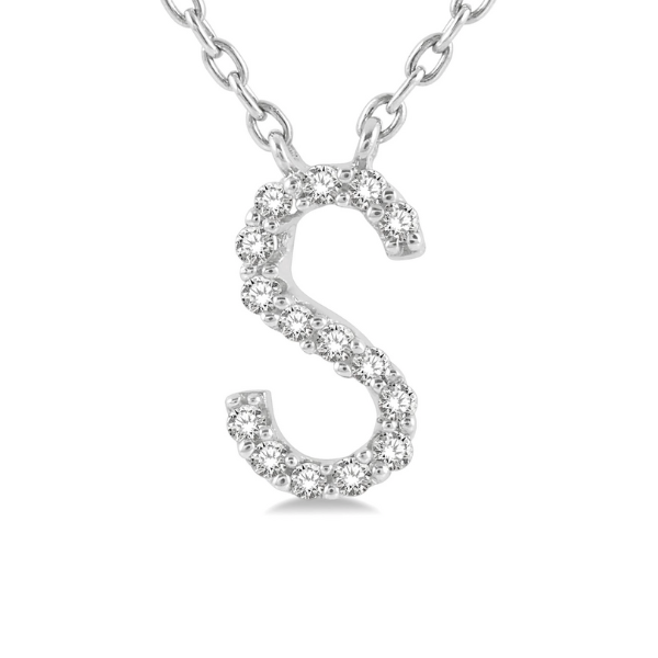 Initial pendants offer a personalized feel. Whether it is wearing one's own initials or the initials of a loved one, the initial pendant is a popular choice. It can be worn by itself or layered with other dainty pendants. So, if you have an 'S' initial in mind, this initial pendant would be a perfect buy. It is also decorated with round-cut diamonds to enhance its appeal. There are a total of 15 prong set round cut diamonds embellishing the initial pendant. A cat chain carries the pendant, both of which are styled in 10-karat white gold. The total diamond weight is 1/20 ctw. Free shipping or in-store pickup.