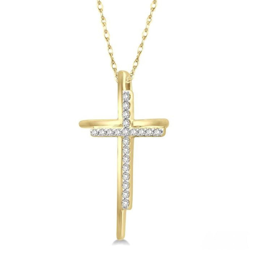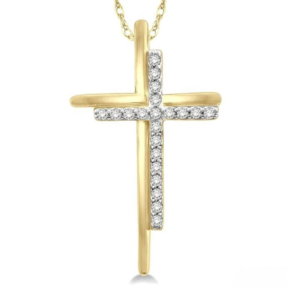 A beautiful cross pendant, this offers a three dimensional effect that makes the pendant quite eye-catching. The pendant features a yellow gold cross with a smaller cross nesting by its side, closely touching the rims of the larger cross. Round cut diamonds decorate the small cross, giving the pendant a spectacular look. There are 21 prong set round cut diamonds adorning it. The pendant is strung on an 18-inch rope link chain that comes included. Both are styled in 10 karat yellow gold. Total diamond weight is 1/10 ctw.