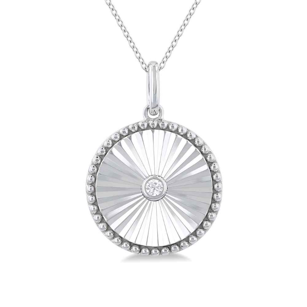 The round is considered a sacred symbol in many cultures. It is worn for its symbolism, as it represents unity, balance, equality, harmony, truth and love. This diamond round pendant offers appeal, and can be gifted to loved ones. It features a round medallion, with a textured center and beaded border. Also, a bezel set round cut diamond nestles in the center of the medallion. The round medallion pendant is held on a 1.00MM SSL cable chain, both of which are styled in sterling silver. Total diamond weight is 1/20 ctw. Enjoy free two day shipping or in-store pickup.