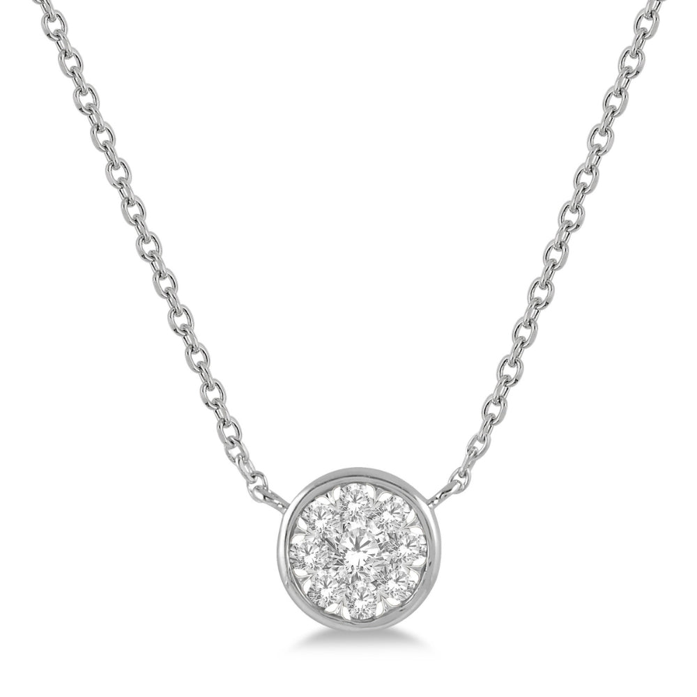 A gleaming Lovebright diamond pendant, this makes a pretty accessory for everyday or evening wear. It features a lustrous round pendant, studded with round-cut diamonds. A 1/20 Ct invisible set round cut diamond embellishes the center, while 8 invisible sets 1/50 Ct round cut diamonds form a halo around this center stone. The pendant is held on an 18 inch Cable Chain that comes with a lobster clasp closure. Both pendant and link chain are molded in 14 Karat white gold. The total diamond weight is 1/6 Ctw.