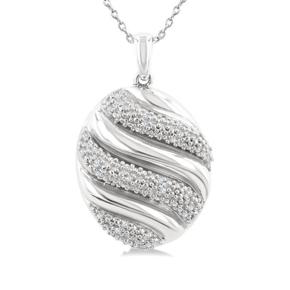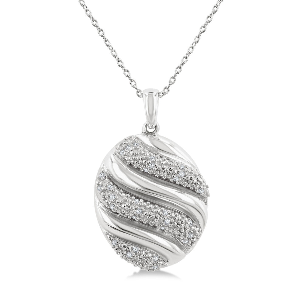 A great addition to one's jewelry collection, this bold diamond fashion pendant effortlessly combines style and sophistication. perfect for any occasion, this striking pendant features an eye-catching chunky, twisted rib design that alternates between polished silver twists and diamond-encrusted swirls. A total of 31 prong set round cut diamonds adorn the pendant, providing an added brilliance to the pendant's gorgeous look. A Cable Chain 1.00 MM in 18 Inches with Spring Lock & Extenders at 16" & 17" comes included with the bold diamond fashion pendant, both of which are styled in rhodium-finished sterling silver. The total diamond weight is 1/10 Ctw.