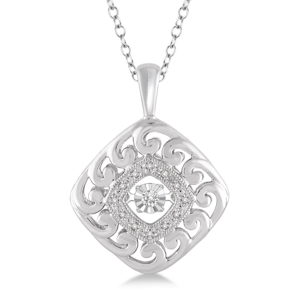 Add style to your look with this diamond emotion pendant. perfectly styled in cool 1sterling silver and featuring a round center stone diamond hanging from two corners, this pendant glistens and gleams with every step she takes. Brilliant 12 pave set round cut diamonds embellish the diamond frame bordered with intricate design. This pendant hangs from a beautiful Cable Chain 1.00 MM in 18 Inches with Spring Lock & Extenders at 16" & 17". The total diamond weight is 1/20 Ctw.