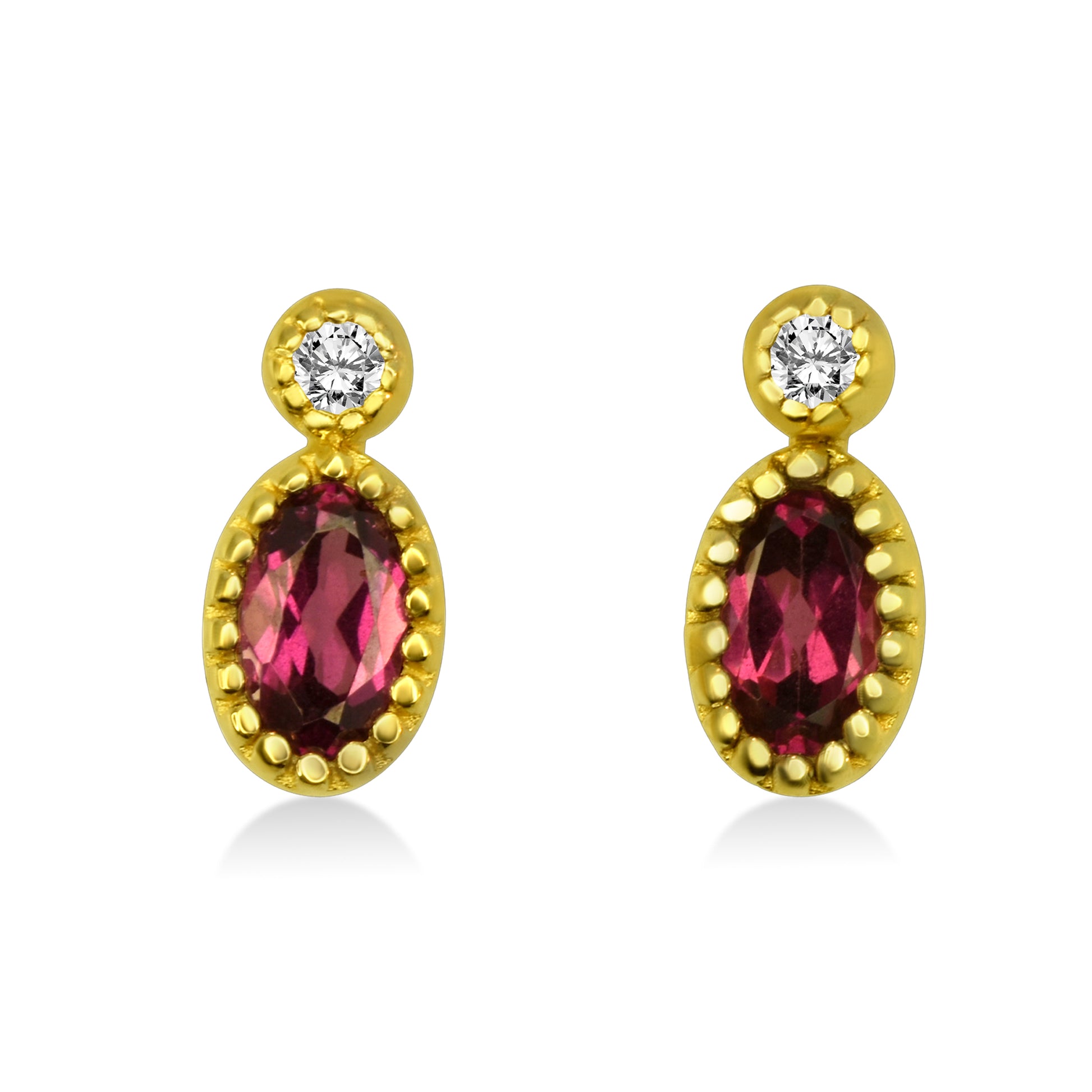 The stunning earrings feature 2 oval-shaped rhodolite gemstones (0.60ctw) paired with two round glittering diamonds (0.05ctw), all set in warm 14k yellow gold. These stunning earrings are sure to make the perfect addition to any jewelry collection and would be a great gift for a loved one or a special treat for yourself. Enjoy free two day shipping or in-store pickup.
