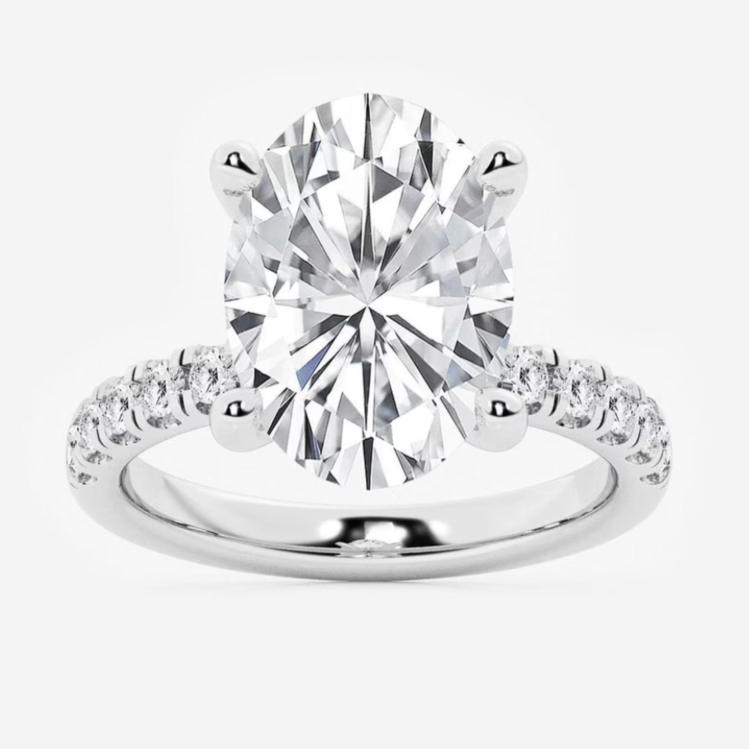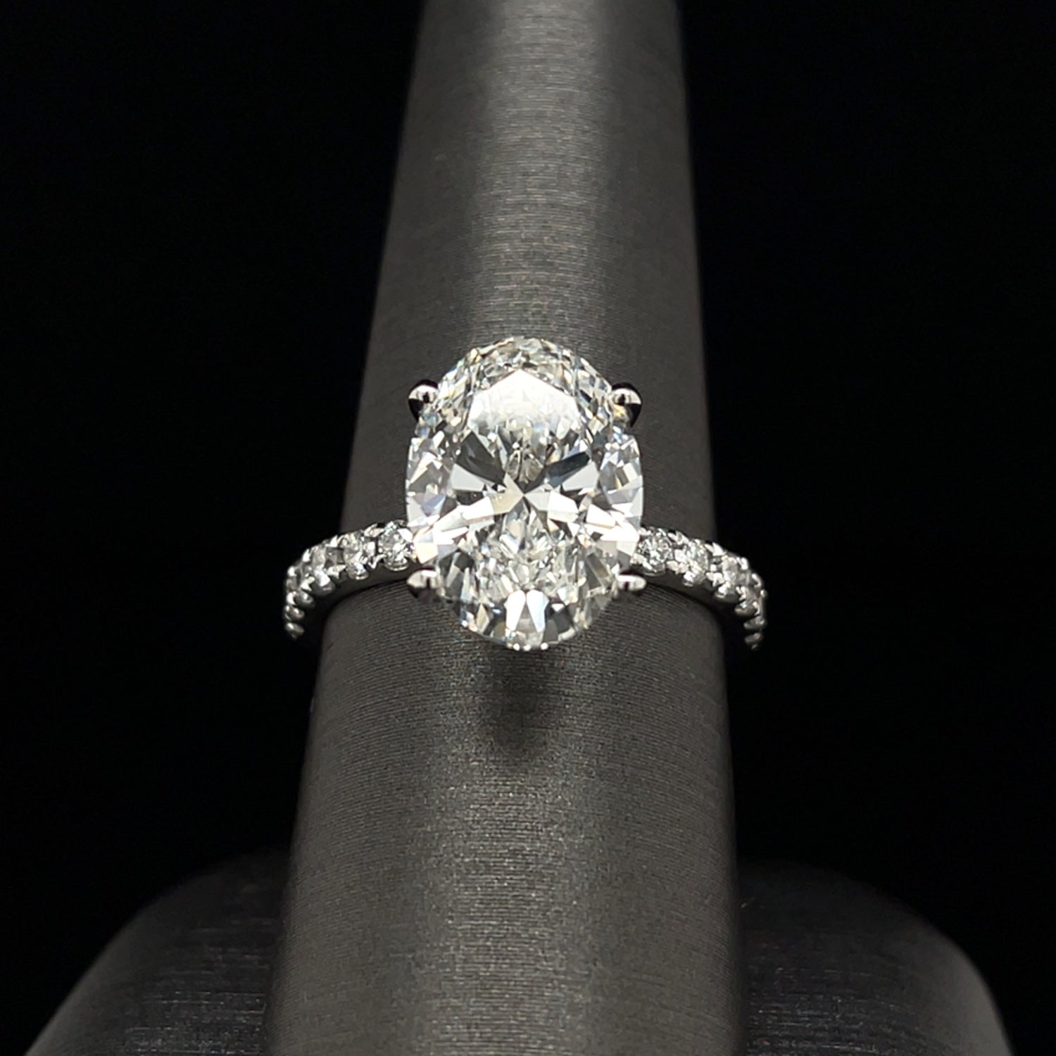 Metal Type/Color: 14 Karat White Gold Diamond Carat Total Weight: 4 1/2 Ctw Center Diamond Carat Weight: 4 Carat Oval Lab Grown. Average Diamond Color: F-G Average Diamond Color: VS # of Side Diamonds: 26 Round Lab Grown Diamonds Free 2 Day Shipping or In-Store Pickup
