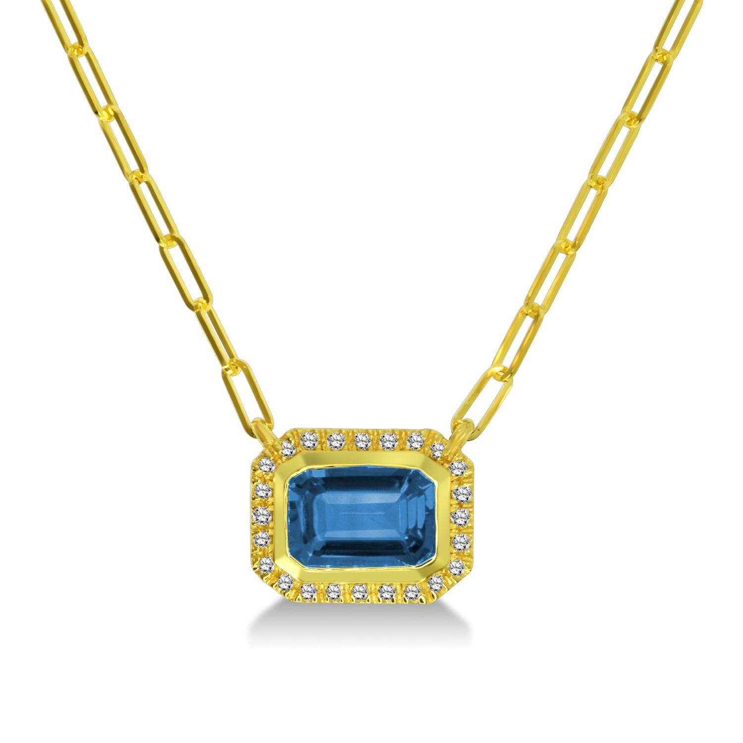 Shop this gorgeous bezel set emerald cut blue topaz and diamond halo paperclip necklace in 14 karat yellow gold with free two day shipping or in-store pickup. Metal Type/Color: 14 Karat Yellow Gold Gemstone Carat Weight: 1.35 Ct Emerald Cut Blue Topaz Diamond Carat Total Weight: 0.12 Ctw | 22 Round Diamonds Lobster Clasp