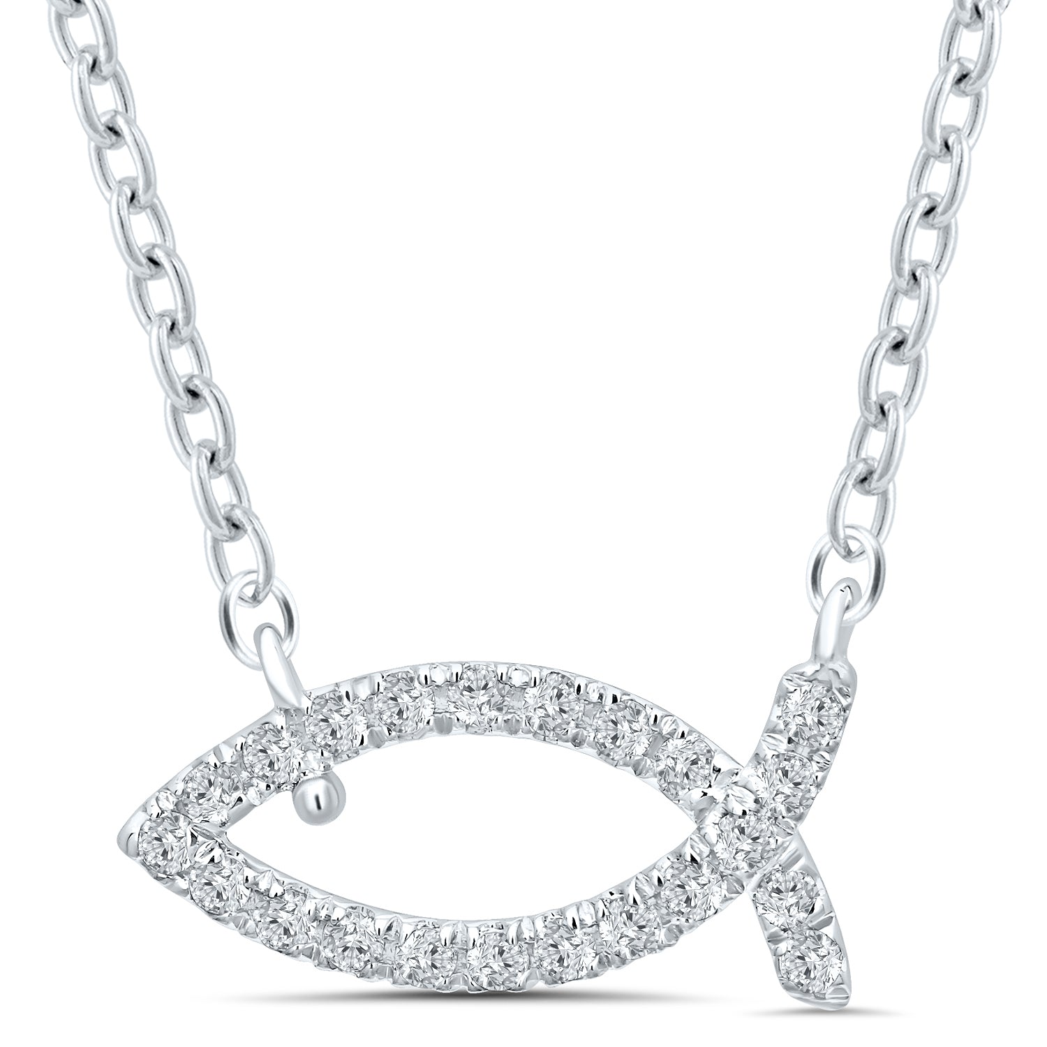 Show your faith with this Diamond Christian Fish Necklace in 10 Karat White Gold (1/10 Ctw). Enjoy free two day shipping or in-store pickup at Robert Irwin Jewelers. Metal Type/Color: 10 Karat White Gold Diamond Carat Total Weight: 1/10 Ctw # of Diamonds: 21 Round Diamonds Diamond Color: I3 Chain Length: 18 Inches