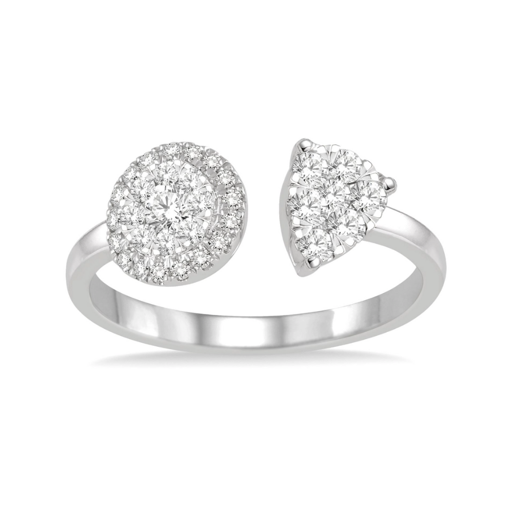This glamorous diamond Lovebright ring is a perfect choice of your beloved. Crafted on 14 karat white gold this ring styled into a very modish frame with open ends exquisitely showcasing round and pear shapes. Each filled with an array of round cut diamonds and engrossed by gorgeous shimmering small round cut diamonds. Brilliant 34 round cut diamonds are set in invisible and pave settings. Total diamond weight is 1/2 ctw.