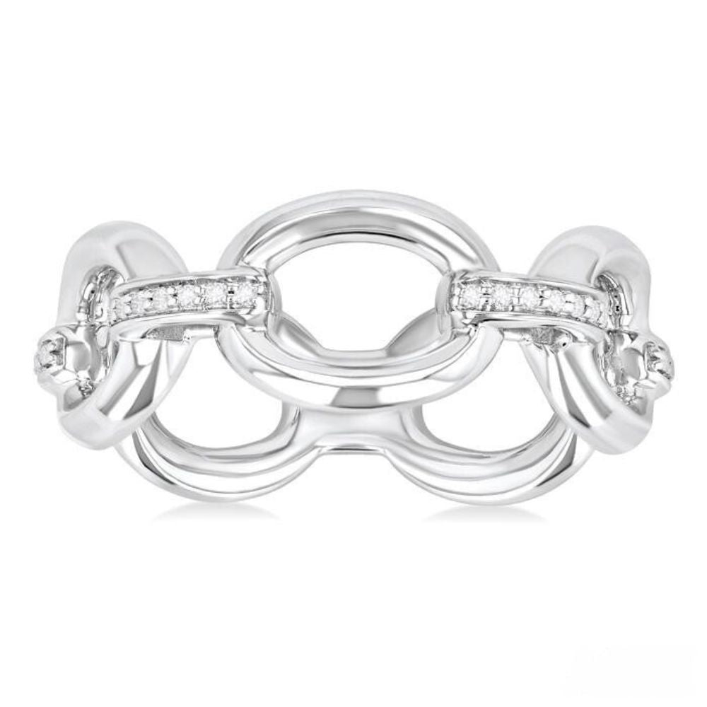 A perfect accessory for any occasion, this subtle yet striking diamond ring is an attractive addition to one's jewelry collection. It features open window oval-shaped links encircling your finger, seamlessly connected by dazzling diamond-adorned D-links. The delicate oval-shaped links offer a smooth silver finish, while the D-links on the ring top are embellished with a total of 14 pave set round cut diamonds, adding a touch of brilliance. Crafted in rhodium-finished sterling silver, this diamond fashion ring is designed to shine and impress and it is just right for any occasion. Total diamond weight is 1/20 ctw.