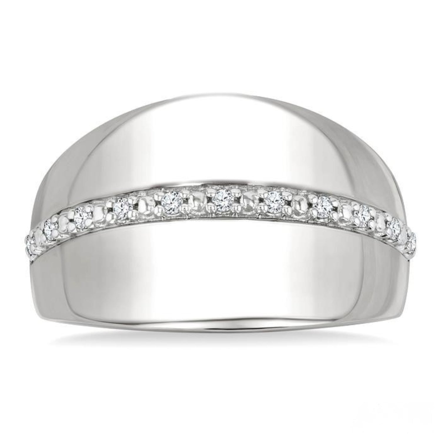 This simple but attractive, bold diamond fashion ring is versatile enough to complement any ensemble. It features a striking wide center that gracefully narrows down the shank, creating a sleek and contemporary silhouette. The focal point of the ring is a row of 11 prong set round cut diamonds, meticulously lined along the mid-rib of the ring top. Molded in sterling silver with a rhodium finish that enhances the overall brilliance of the diamonds, this ring makes for a true standout accessory. The total diamond weight is 1/10 Ctw.