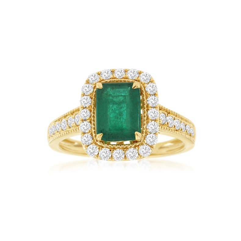 14 Karat Yellow Gold Emerald Cut Emerald and Diamond Halo Ring