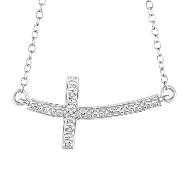 Symbolize the emotion of divine love with this charming diamond cross pendant. Styled in lustrous sterling silver, this attractive cross pendant is embellished with radiant 8 prong set round cut diamond. This pendant hangs up from a beautiful Cable chain. Total diamond weight is 1/50 ctw. Enjoy free two day shipping or in-store pickup.