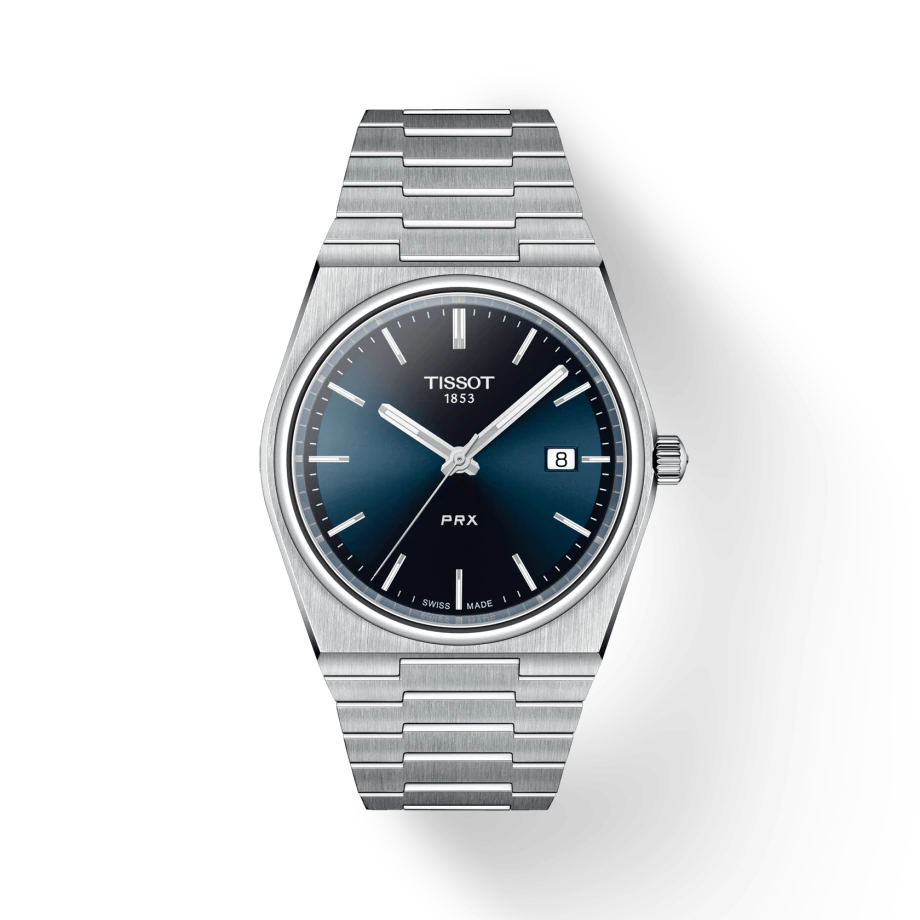 Tissot PRX Stainless Steel Gents Watch T-Classic Collection Water Resistance: 100m Tonneau Case Shape 316L Stainless Steel Case 10.4mm Case Thickness 40.00mm Case Length and Width Scratch Resistant Sapphire Crystal 25,6mm Diameter Swiss Quartz Movement Indexes Blue Dial Color Stainless Steel Strap Butterfly Clasp With Push Buttons Free Shipping or In-Store Pickup