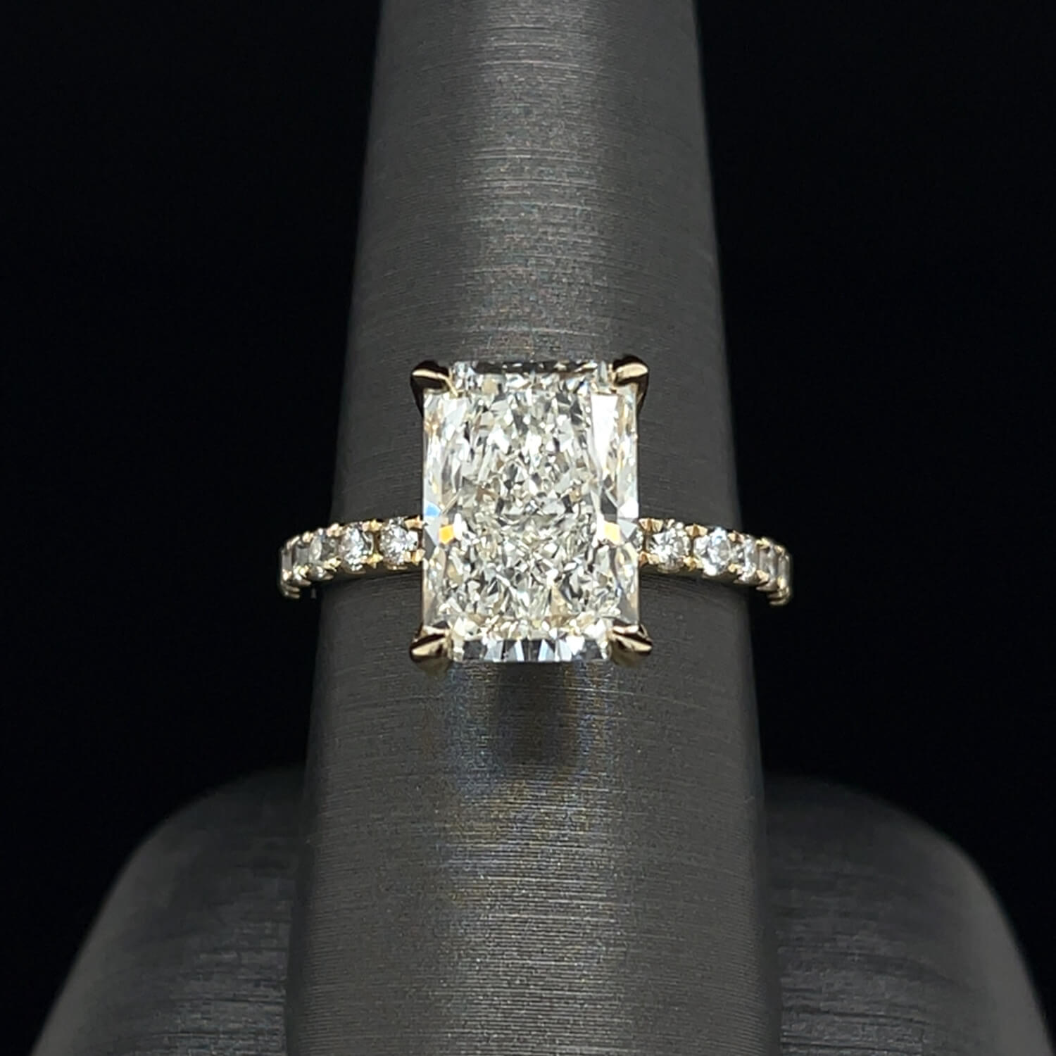Shop this absolutely stunning radiant cut hidden halo lab grown diamond engagement ring in 14 karat yellow gold with free two day shipping or in-store pickup. This engagement ring features a 4 carat lab grown radiant center diamond. Enjoy free ring sizing for life with your engagement ring purchase only at Robert Irwin Jewelers.