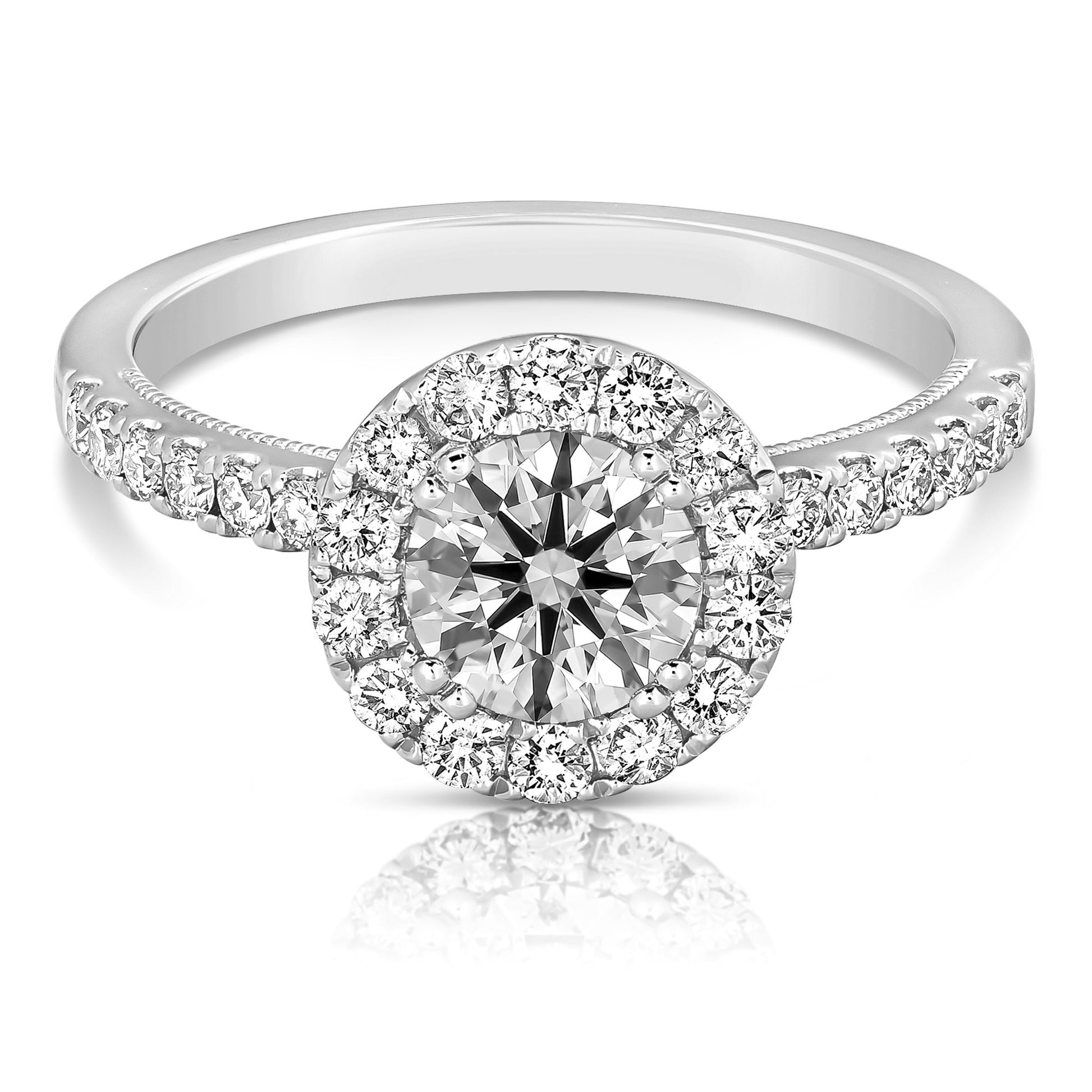Shop this beautiful round diamond halo engagement ring in 14 karat white gold with free two day shipping or in-store pickup.