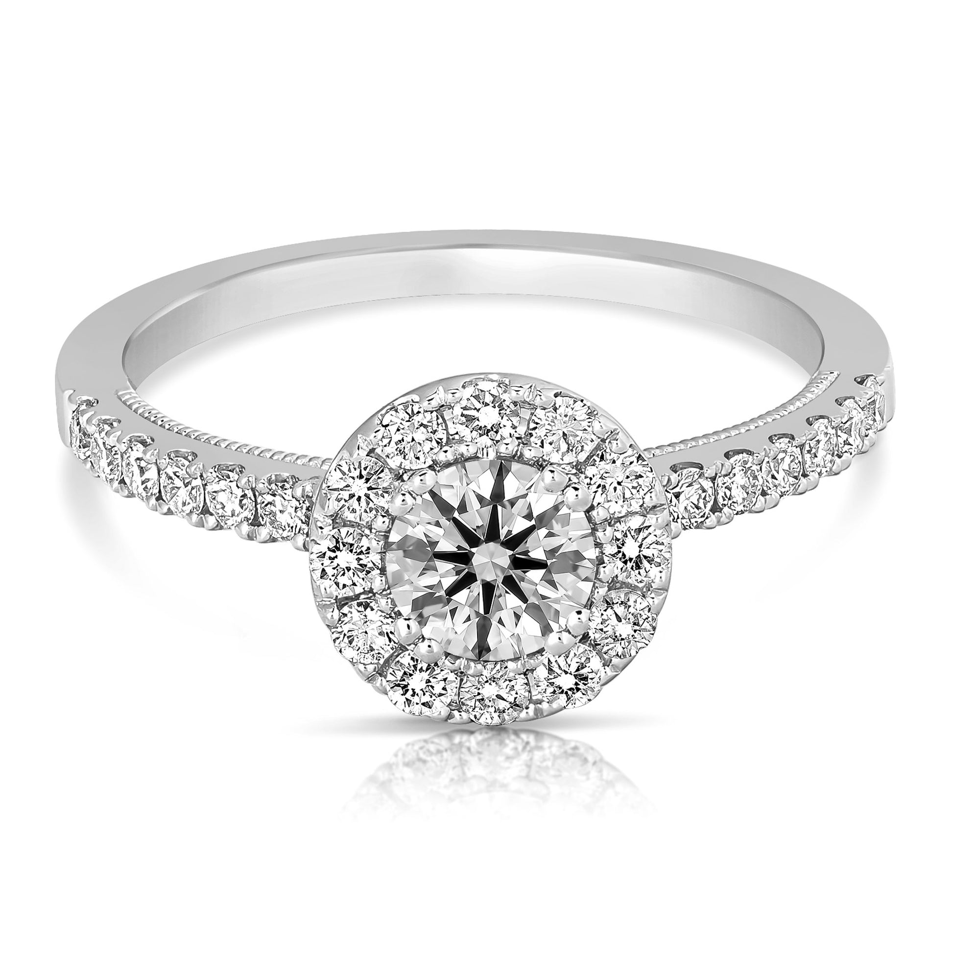 Shop this beautiful round diamond halo engagement ring in 14 karat white gold with free two day shipping or in-store pickup.