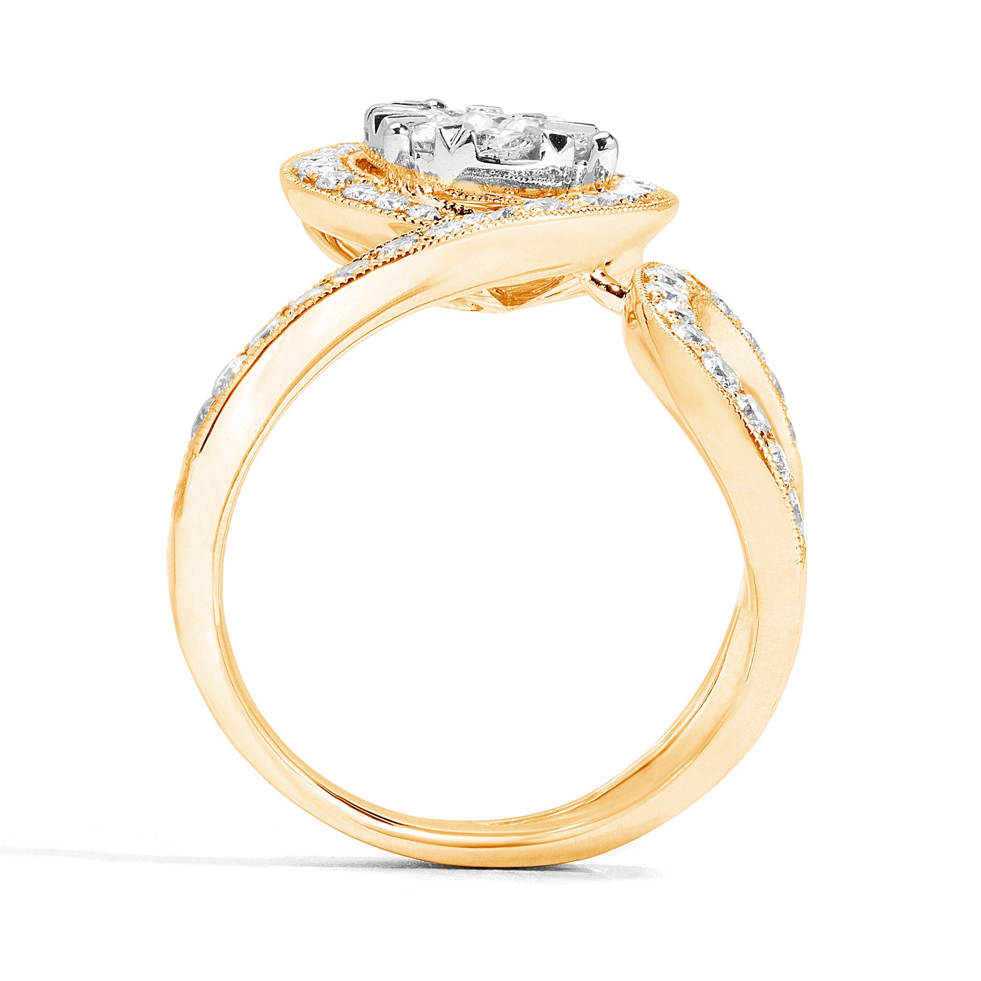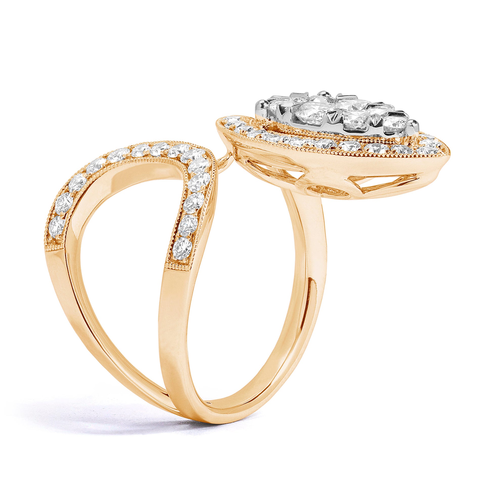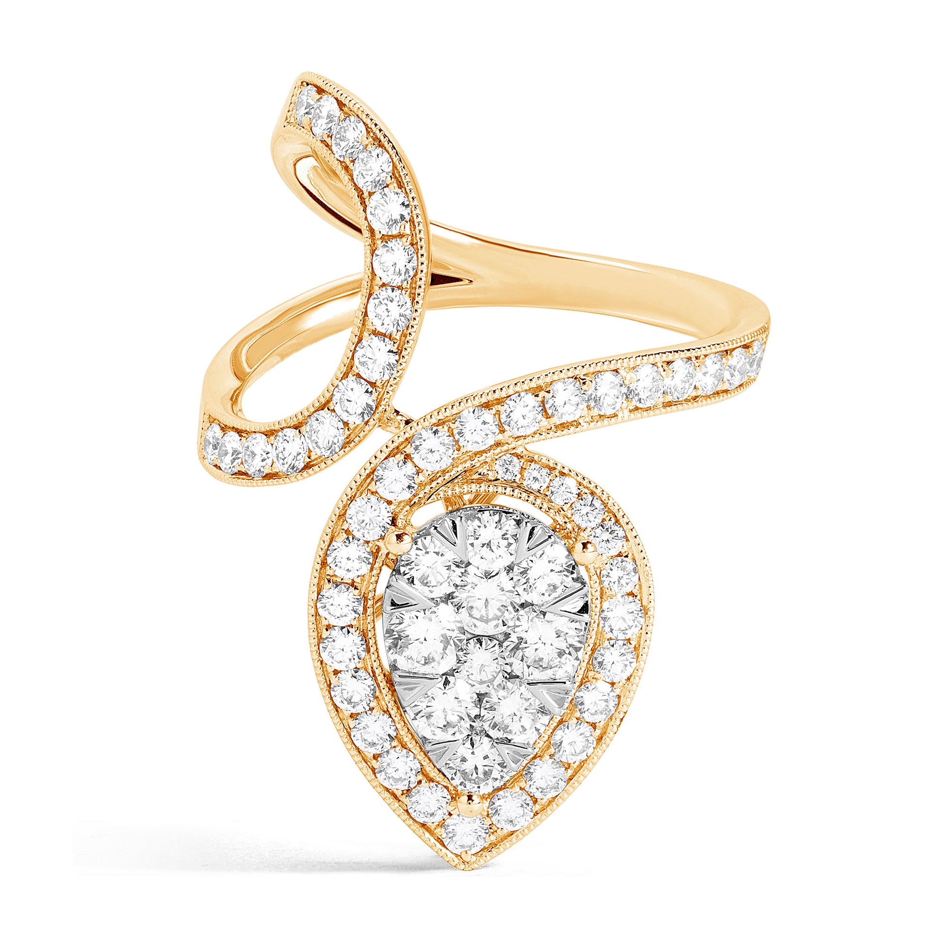 1.60 Carat Round Diamond Pear Shaped Couture Fashion Ring in 18K Yellow and White Gold Angels descend from the heavens above, parting silken clouds, holding iridescent bouquets of ethereal florets which illuminated the canvas of the sky. She reached out to grasp at a blossom from the celestial bundle. It touches her hand and transforms into the most beautiful floral ring any Earthly being had ever seen.