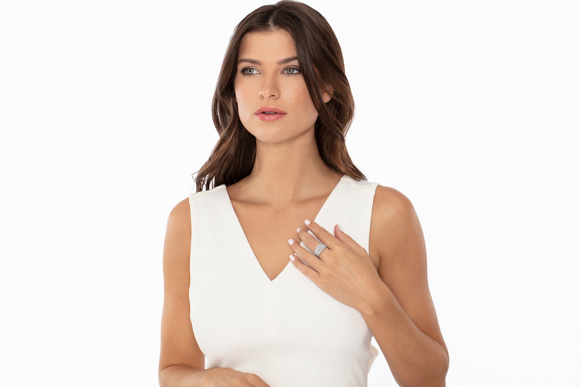 The Robert Irwin Couture Alma Duchess Diamond Band features 2 ctw of breathtaking diamonds, beautifully arranged in four elegant rows on a band of 18K white gold. Part of the Duchess Collection, this band embodies luxurious fashion with regal sophistication, making it perfect for elevating everyday jewelry. With clean lines and timeless beauty, the design captures royal decadence wrapped in subtle grace. This essential luxury piece, like others in the collection, is a modern classic, combining the brilliance of diamonds with stately elegance for a look that will never go out of style.