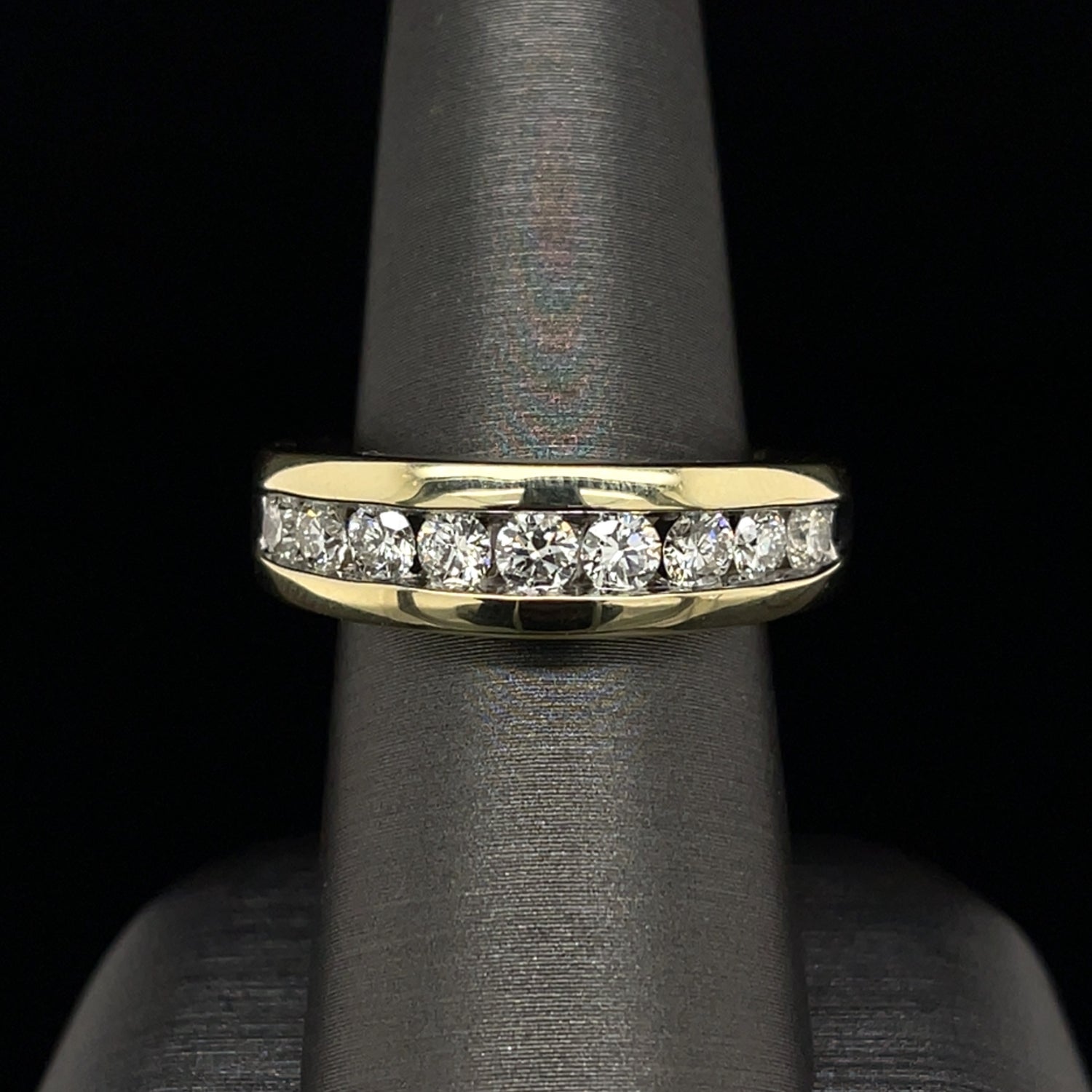 Shop this stunning 1 carat total weight channel set mens diamond wedding band in 10 karat yellow gold with free two day shipping or in-store pickup at Robert Irwin Jewelers. Metal Type/Color: 10k Yellow Gold Diamond Carat Total Weight: 1.00 Ctw Total # of Diamonds: 9 Round Diamonds. Diamond Color: H-I Color Diamond Clarity: I1 Clarity