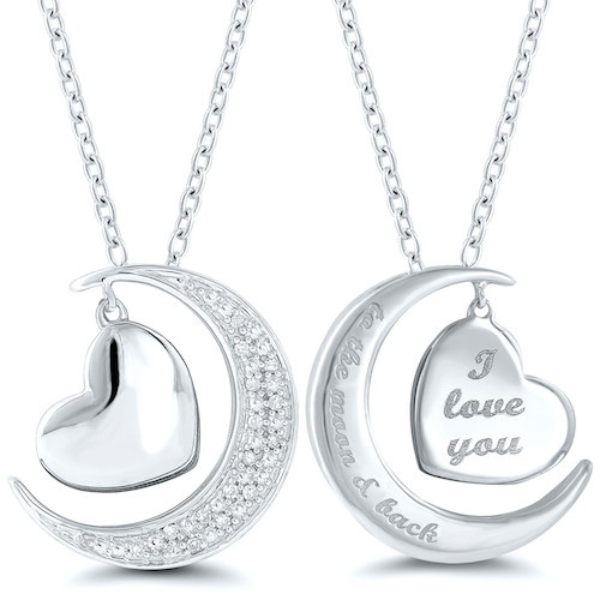 Inscribed with a sweet secret message on the back, this sterling silver, and diamond moon and heart pendant reads "I love you to the moon and back"- a perfect sentiment for any kind of love. S/S diamond moon with dangling heart pendant - 0.05ctw; 15 - 0.0033ct Rd S/C (IJ/I2) (F-dwt=2.36) Includes S/S 18" cable chain. I love you to the moon & back" laser inscribed message on the back of the pendant. Enjoy free 2 day shipping or in-store pickup.