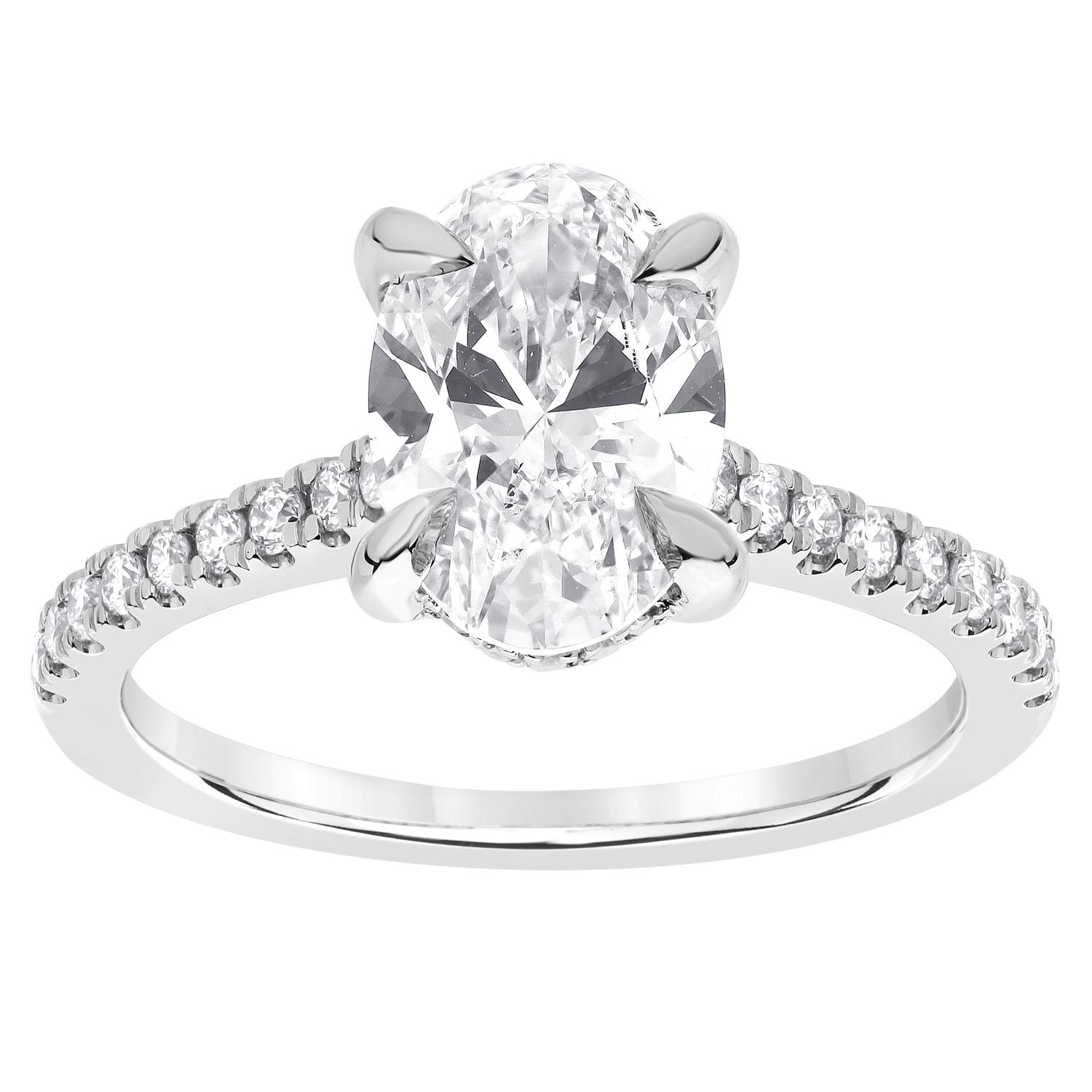 Shop this beautiful oval lab grown diamond engagement ring in 14 karat white gold with free two day shipping or in-store pickup. This engagement ring features a 3 carat oval lab grown center diamond. Enjoy free ring sizing for life with your engagement ring purchase, only at Robert Irwin Jewelers.