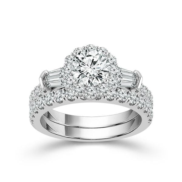 Metal Type/Color: 14 Karat White Gold Diamond Carat Total Weight: 2 Carats Center Diamond Carat Weight: 3/4 Carat Total Number of Diamonds: 40 Round and 4 Bagutte Cut Lab Grown Diamonds Diamond Color: G-H Diamond Clarity: SI1-SI2 Free Shipping or In-Store Pickup