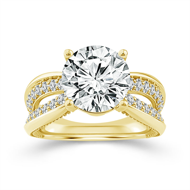 Metal: 14k Yellow Gold Total Diamond Weight: 3 Ctw or Larger Center Diamond Carat Weight Range: 3 Ct Round Lab Grown Diamond # of Side Diamonds: 40 Round Lab Grown Diamonds (5/8 Ctw) Guaranteed Diamond Color Range: E-F Color Guaranteed Diamond Clarity Range: VS1-VS2 Cut: Excellent