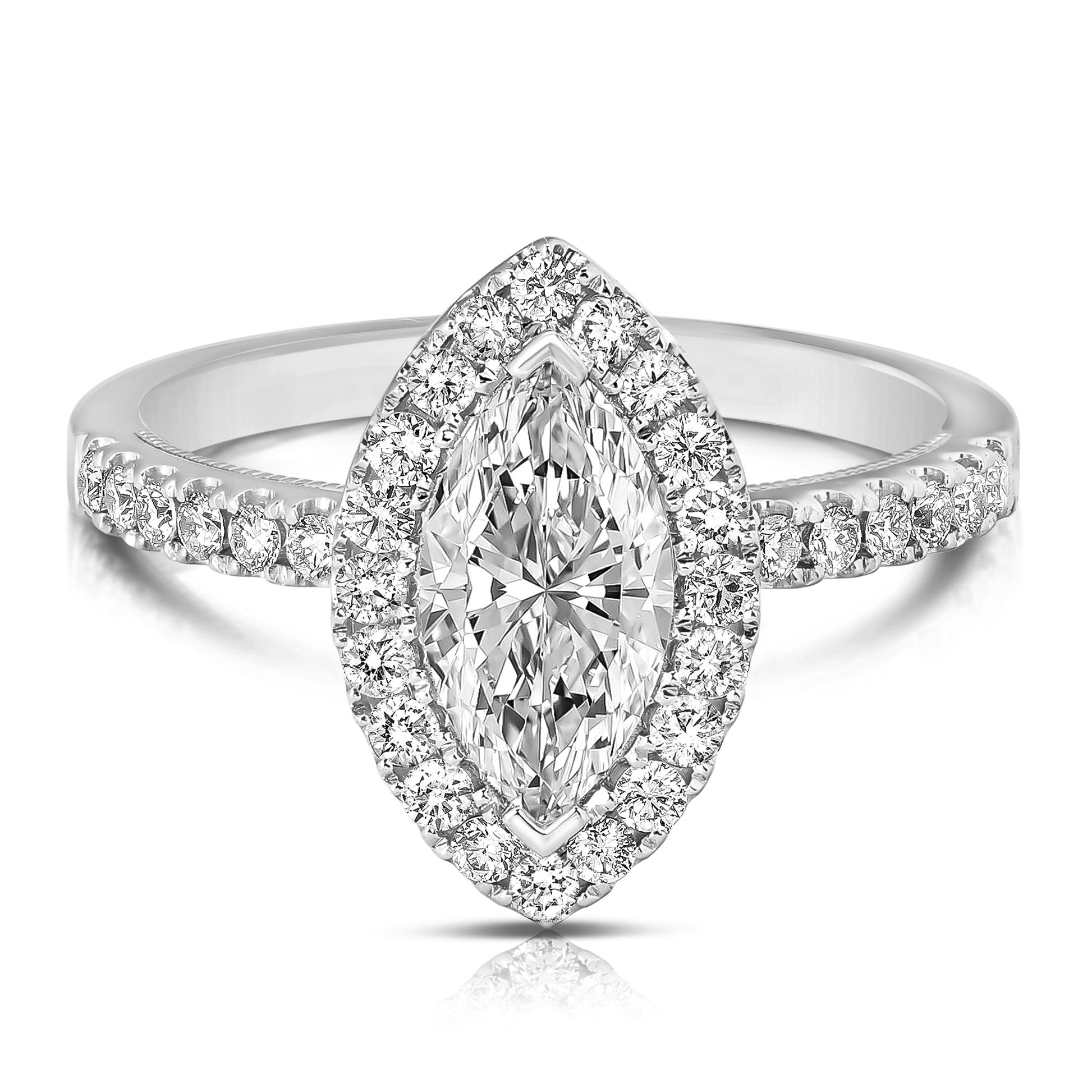 Shop this beautiful marquise diamond halo engagement ring in 14 karat white gold with free two day shipping or in-store pickup.