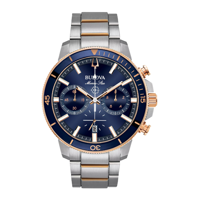 From the Marine Star Collection New six-hand chronograph movement with 200-meter water resistance. In stainless steel with rose gold-tone accents and blue glass insert on ratcheted rotating bezel, blue dial with luminous hands and markers, and calendar feature, domed mineral crystal, screw-back case, stainless steel and rose-gold tone bracelet with fold-over buckle closure, safety bar and extender. 45mm Case Width. Free Shipping or In-Store Pickup.