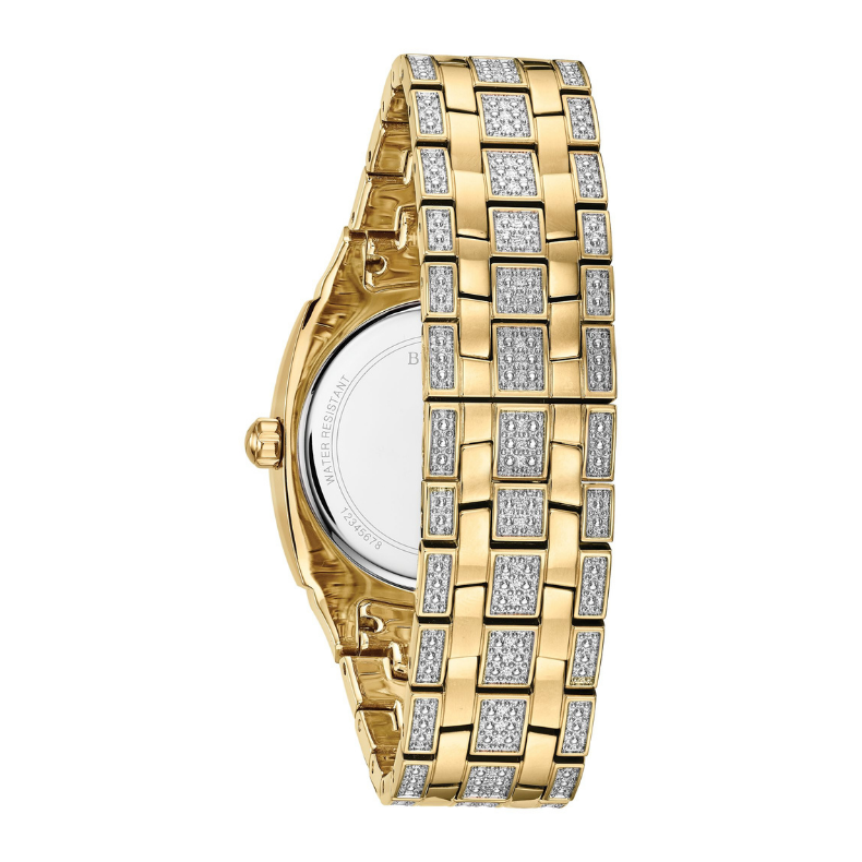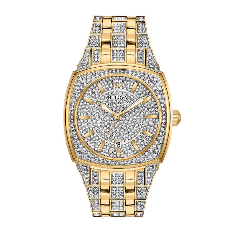 Dress watch opulently embellished with 582 crystals on the cushion-shaped stainless steel and gold-tone case and bracelet, and round pave set three-hand silver white dial with date feature. Curved mineral crystal, deployant closure, quartz movement, and water resistance to 30 meters. Free shipping or in-store pickup.