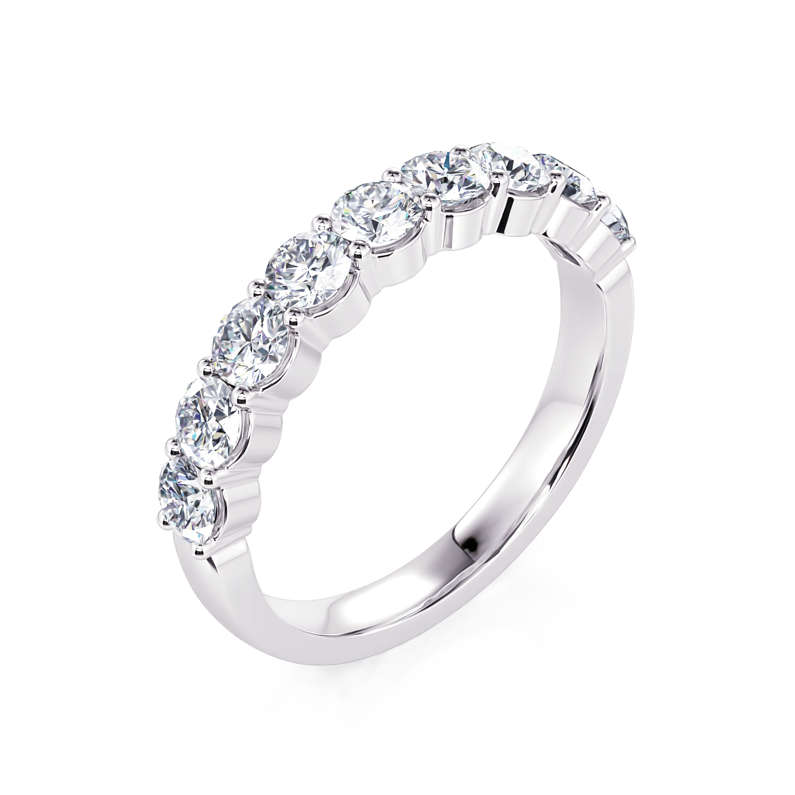 This beautiful classic shared prong diamond wedding band features 3/4 ctw of round diamonds going halfway down the shank.