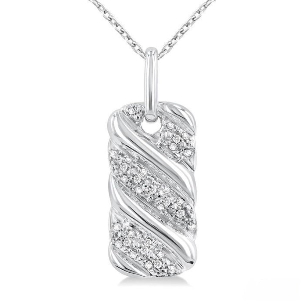 Perfect for any occasion, this stylish diamond bold fashion pendant will add a touch of brilliance to your ensemble. The pendant features an eye-catching chunky, ribbed swirl design, blending polished silver swirls with diamond-encrusted ones for a striking, alternating pattern. A total of 32 pave set round cut diamonds adorn the pendant, adding a brilliant sparkle to its bold and distinctive design. Paired with a sleek 1.00MM SSL cable chain, the beautiful diamond fashion pendant and chain are molded in a rhodium finished sterling silver. Total diamond weight is 1/10 ctw.