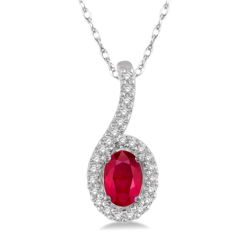 10 Karat White Gold 6x4mm Oval Cut Ruby 1/8 Carat Total Weight Diamonds 25 Round Diamonds 18 Inch Chain With Spring Clasp Free Shipping or In-Store Pickup