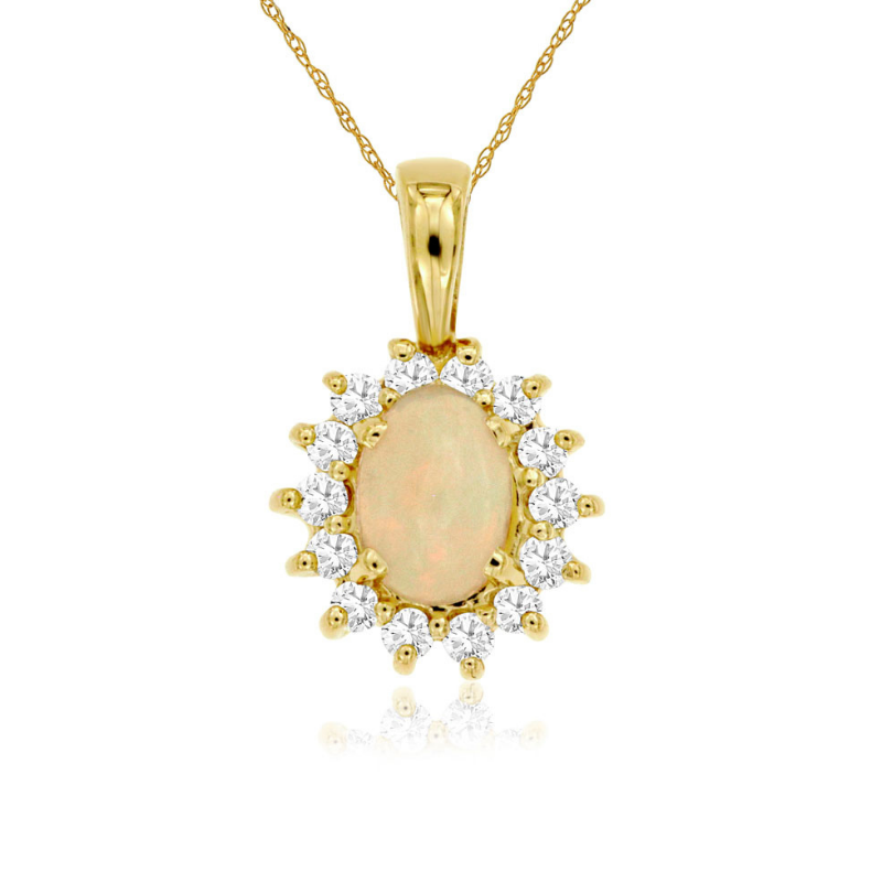 Metal Type/Color: 14 Karat Yellow Gold Gemstone Size and Shape: 1/2 Carat Oval Opal Diamond Carat Total Weight: 1/3ctw Total Number of Diamonds: 14 Round Diamonds Chain Length: 18 Inches With Spring Clasp Metal Weight: 2 Grams Free Shipping or In-Store Pickup